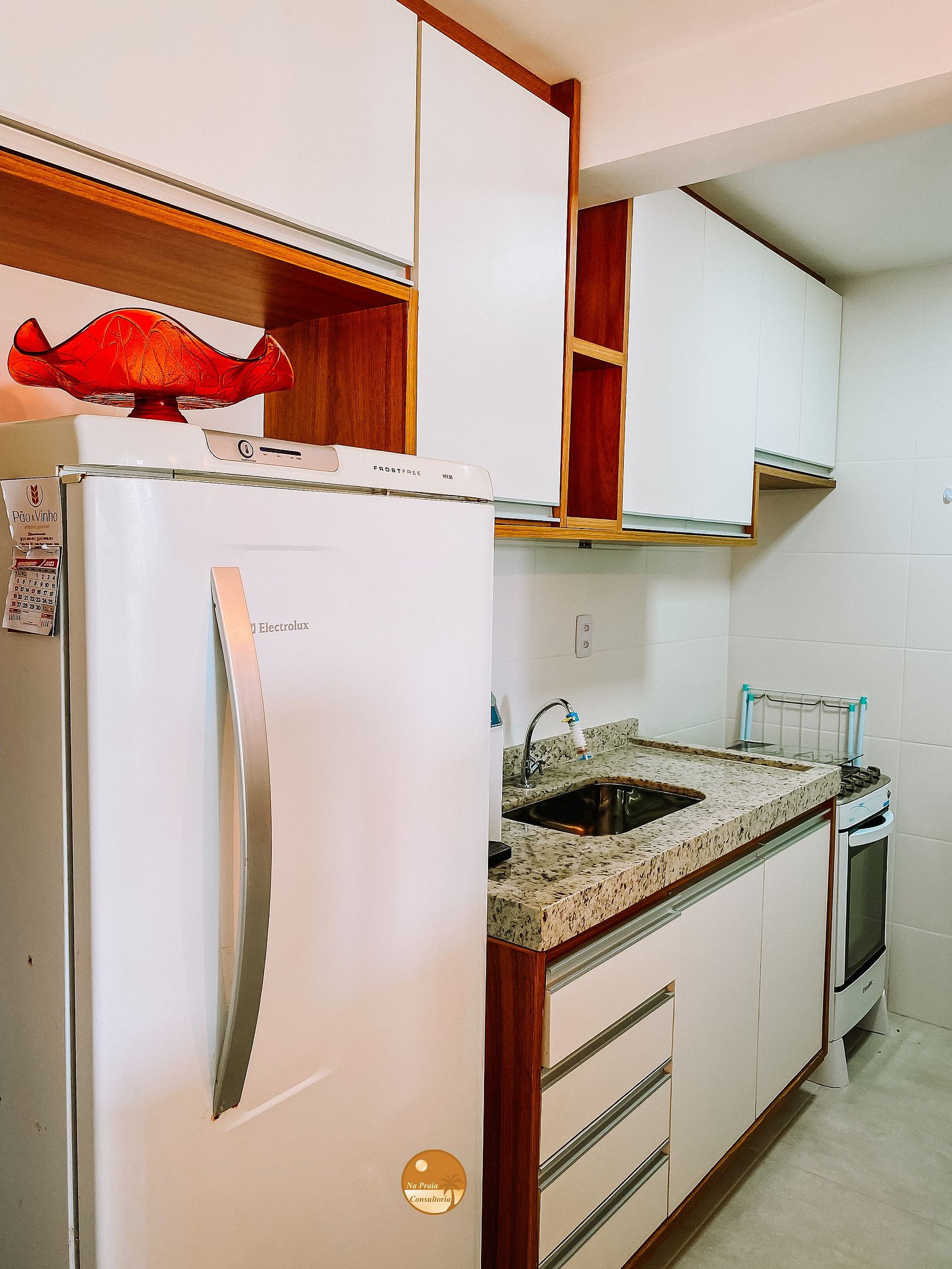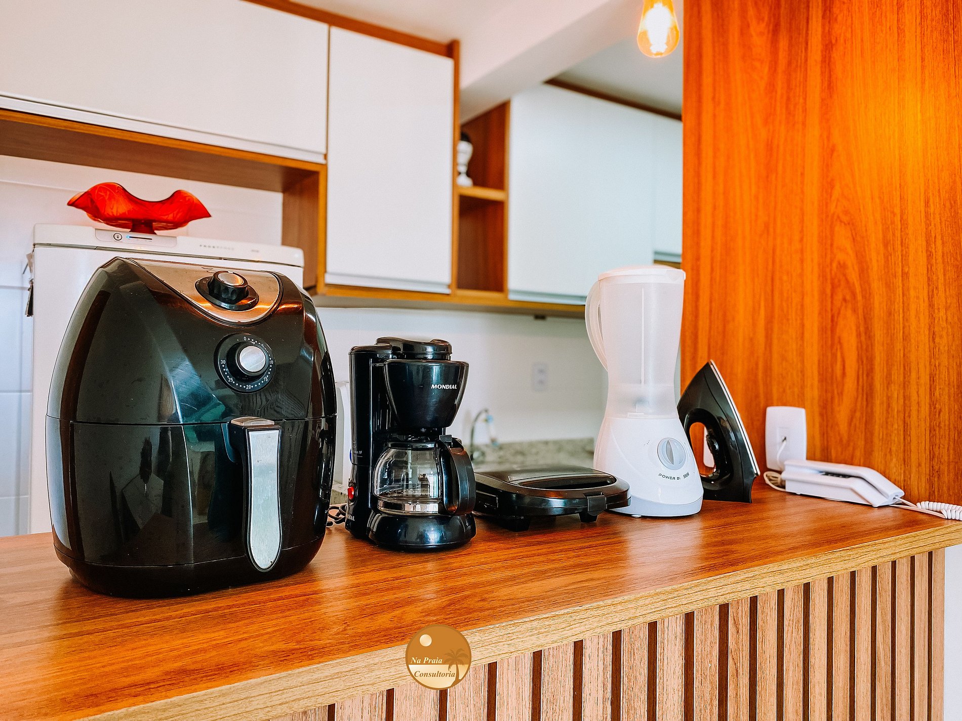 * Cozinha: Totalmente equipada, cafeteira, microondas, sanduicheira, liquidificador, air fryer, geladeira com congelador, fogão com 4 bocas, Forno e filtro de água.