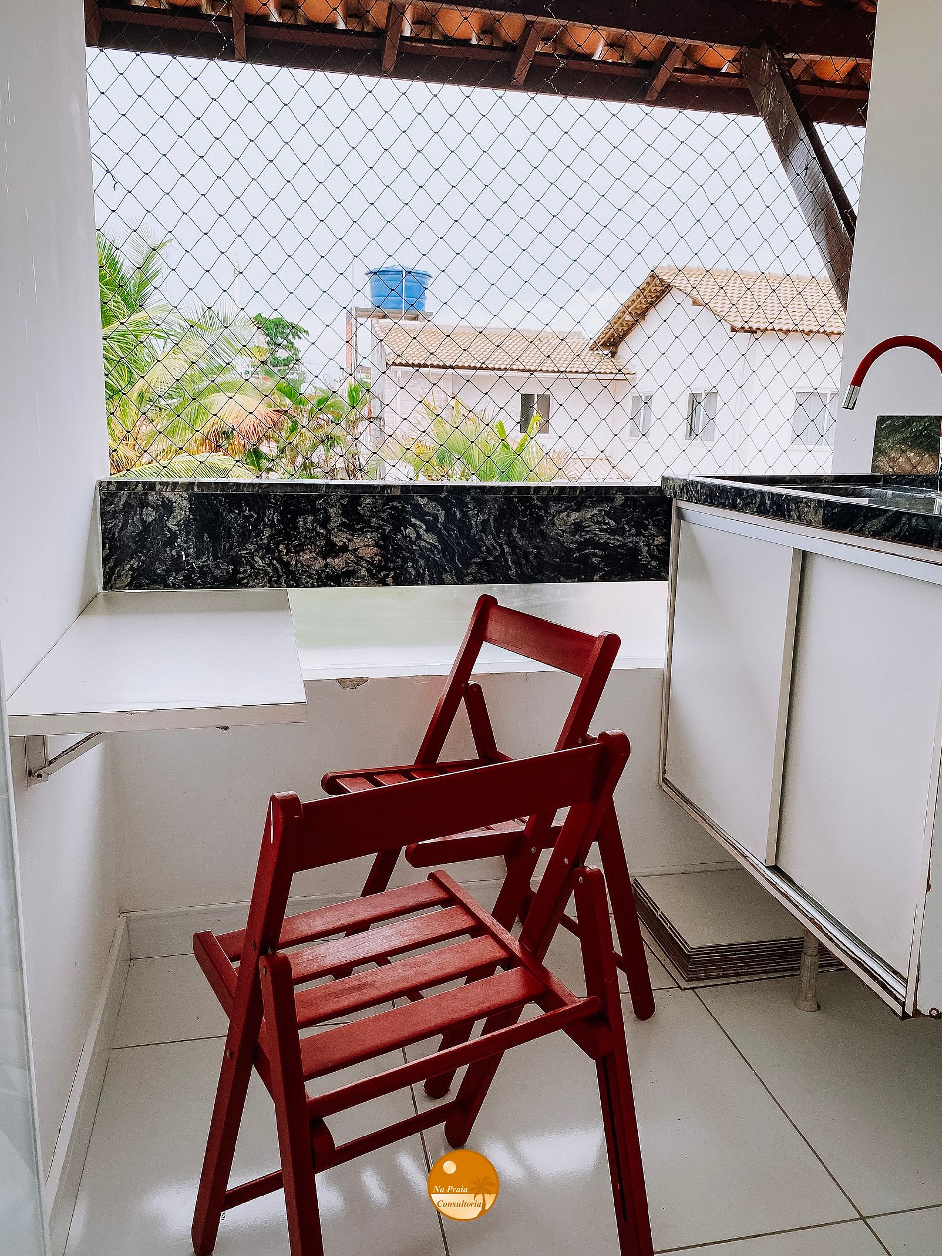 * Varanda: Pia com torneira, mesa dobrável, 2 cadeiras dobráveis e rede de proteção.