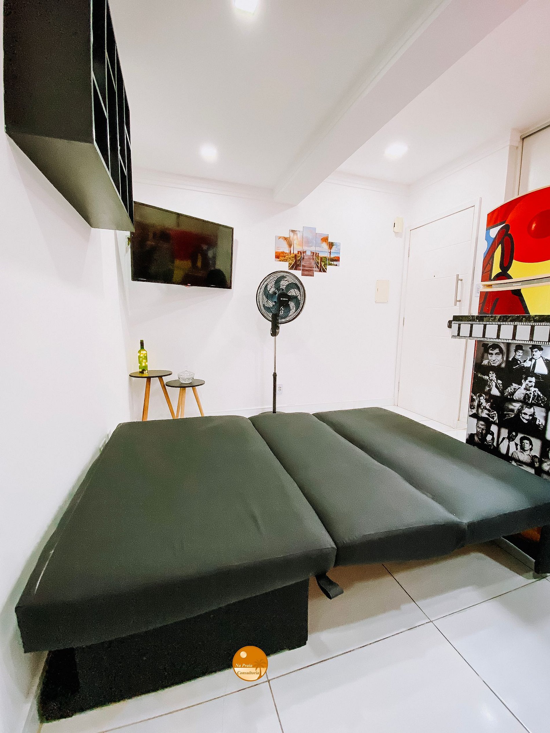 Bancada com 3 banquetas, Smart TV, Ventilador Portátil, mesinhas de canto, sofá cama.