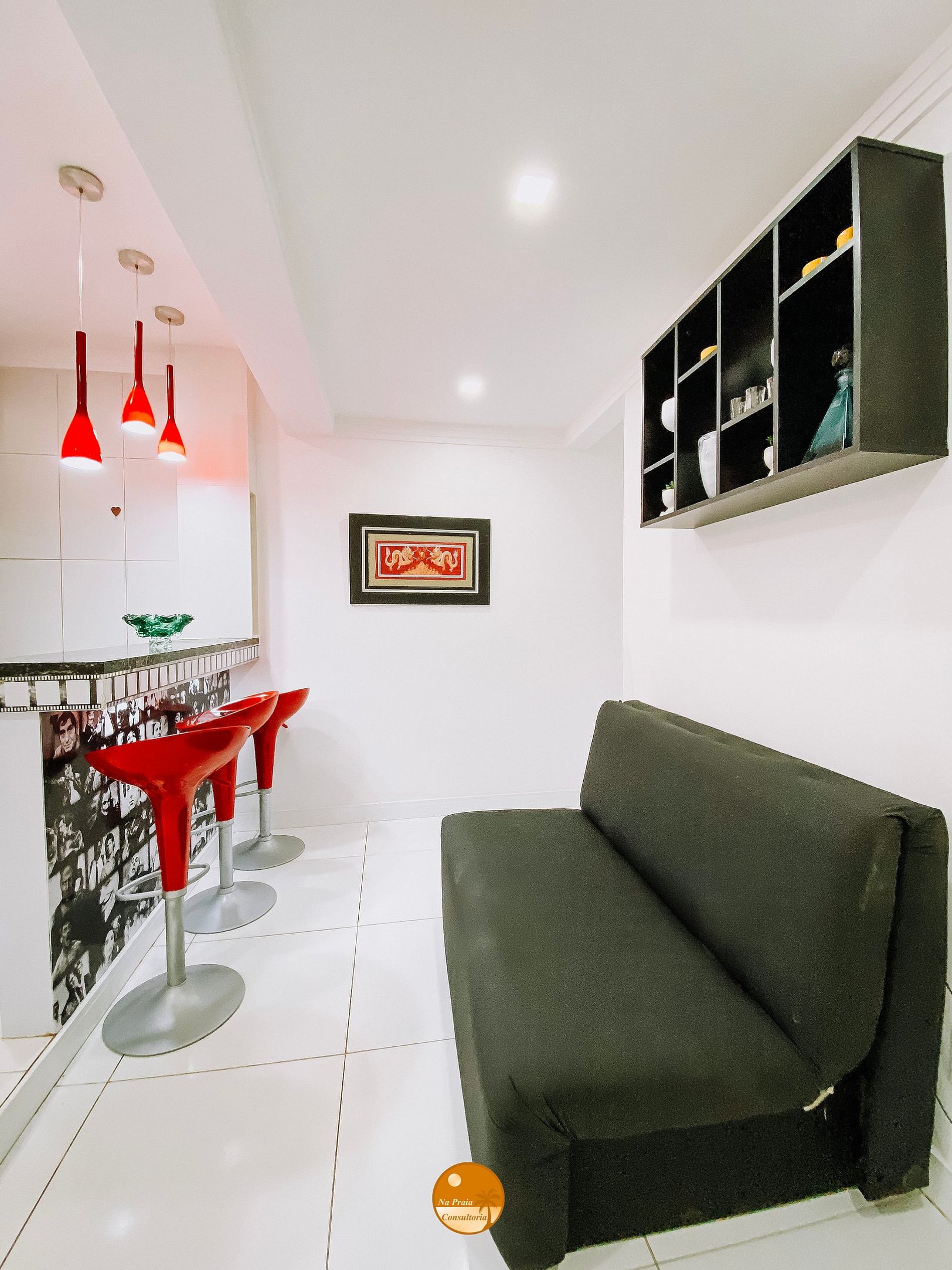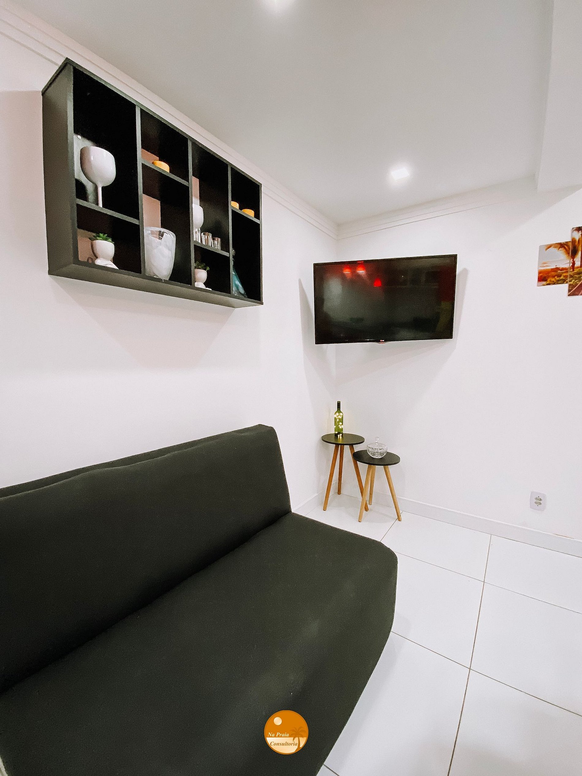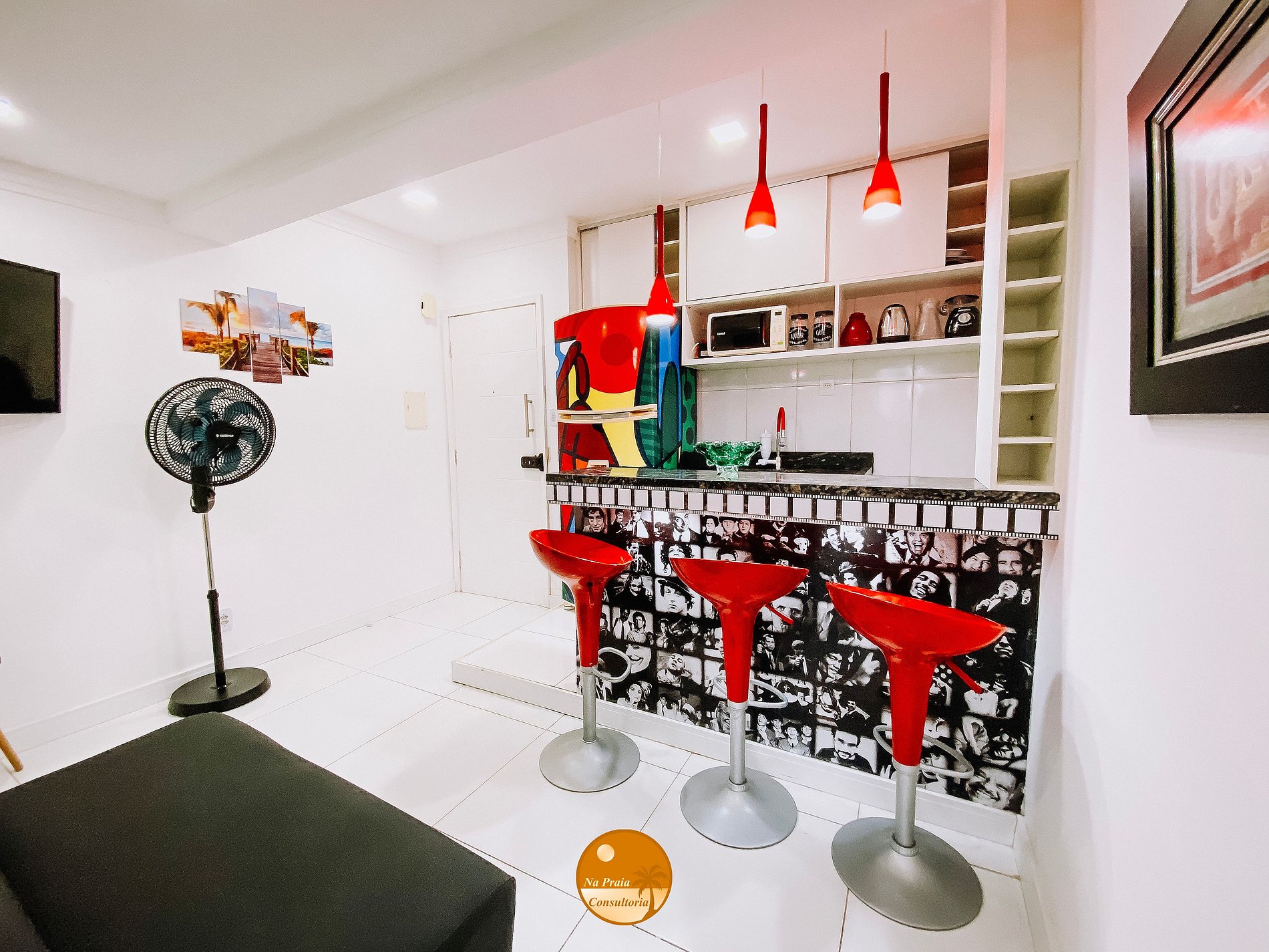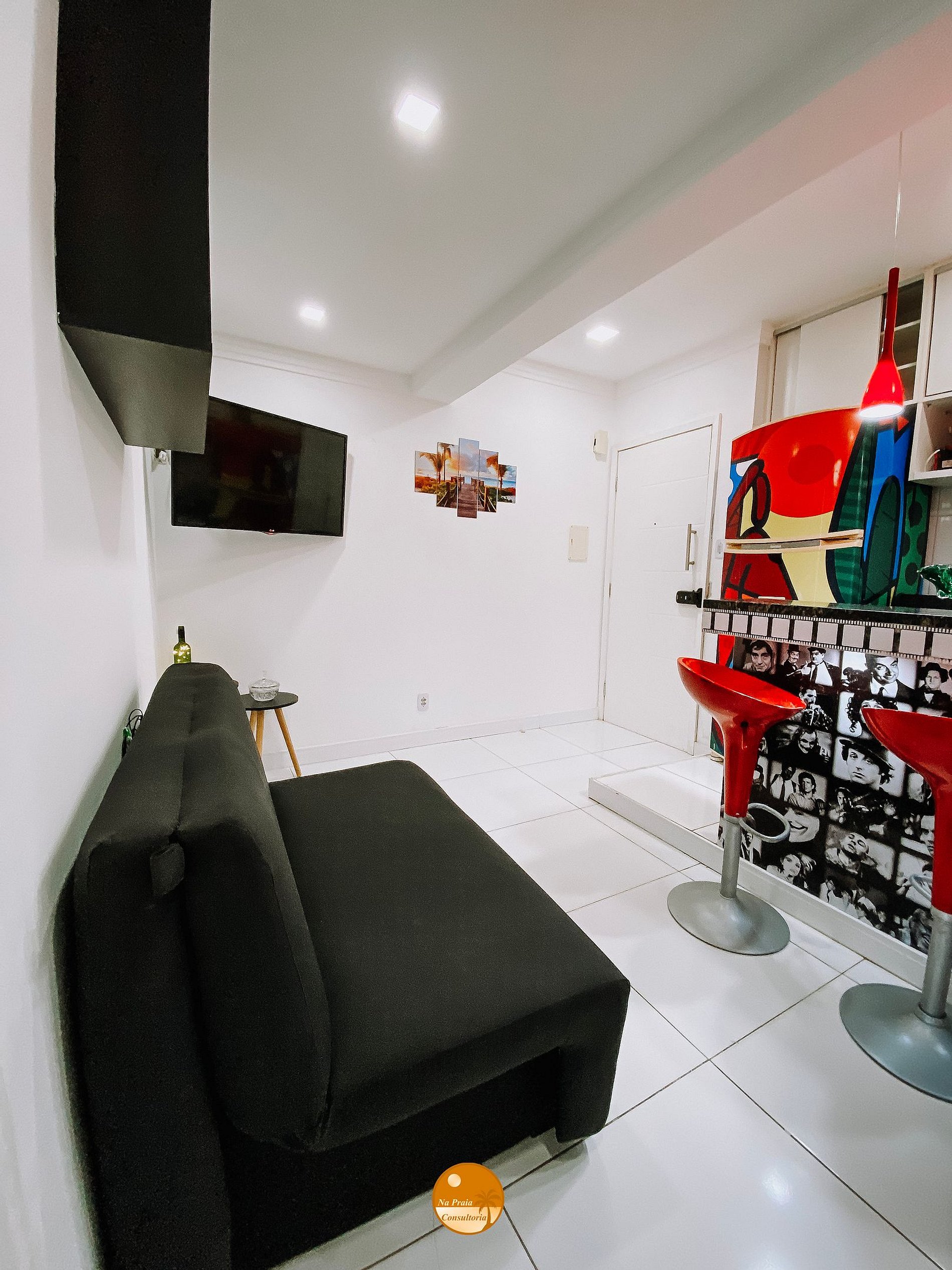 Bancada com 3 banquetas, Smart TV, Ventilador Portátil, mesinhas de canto, sofá cama.
