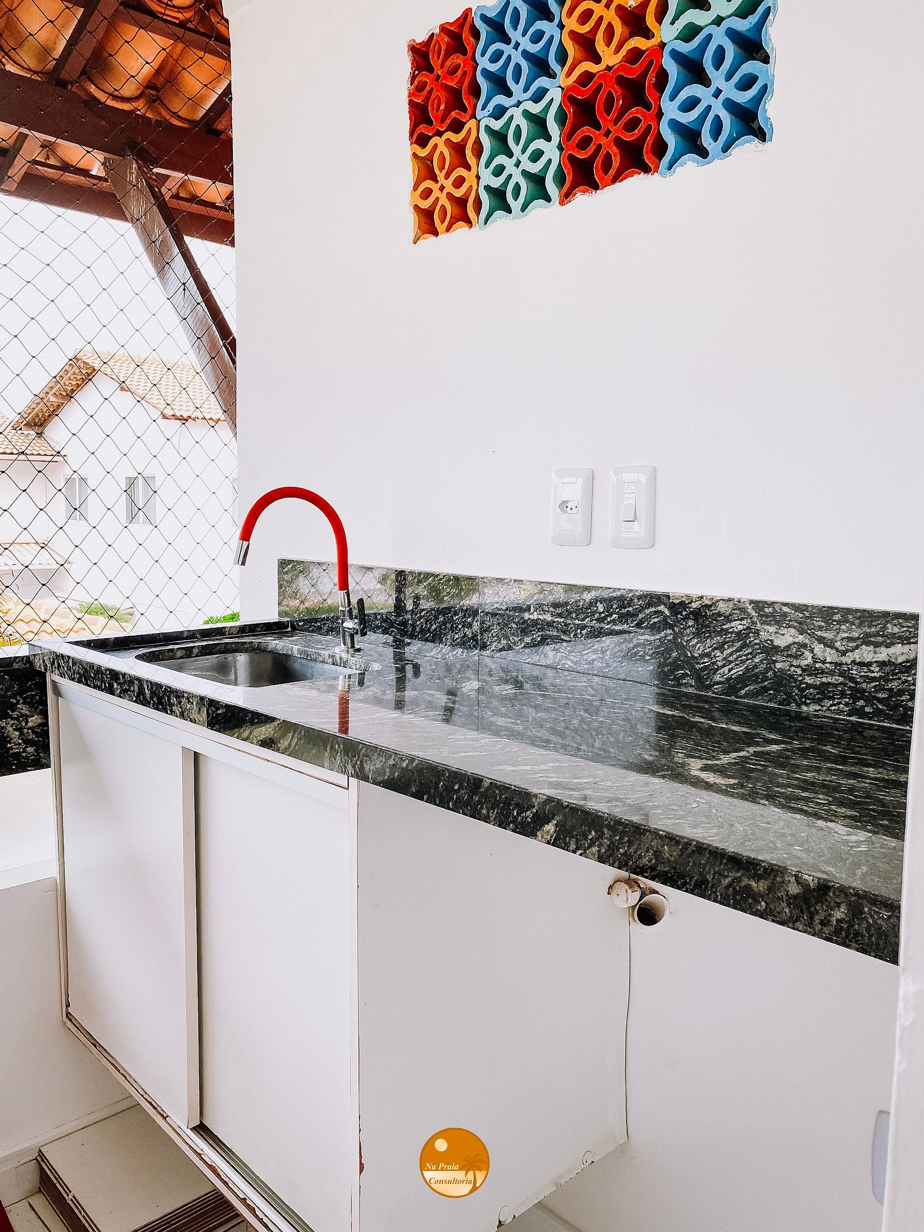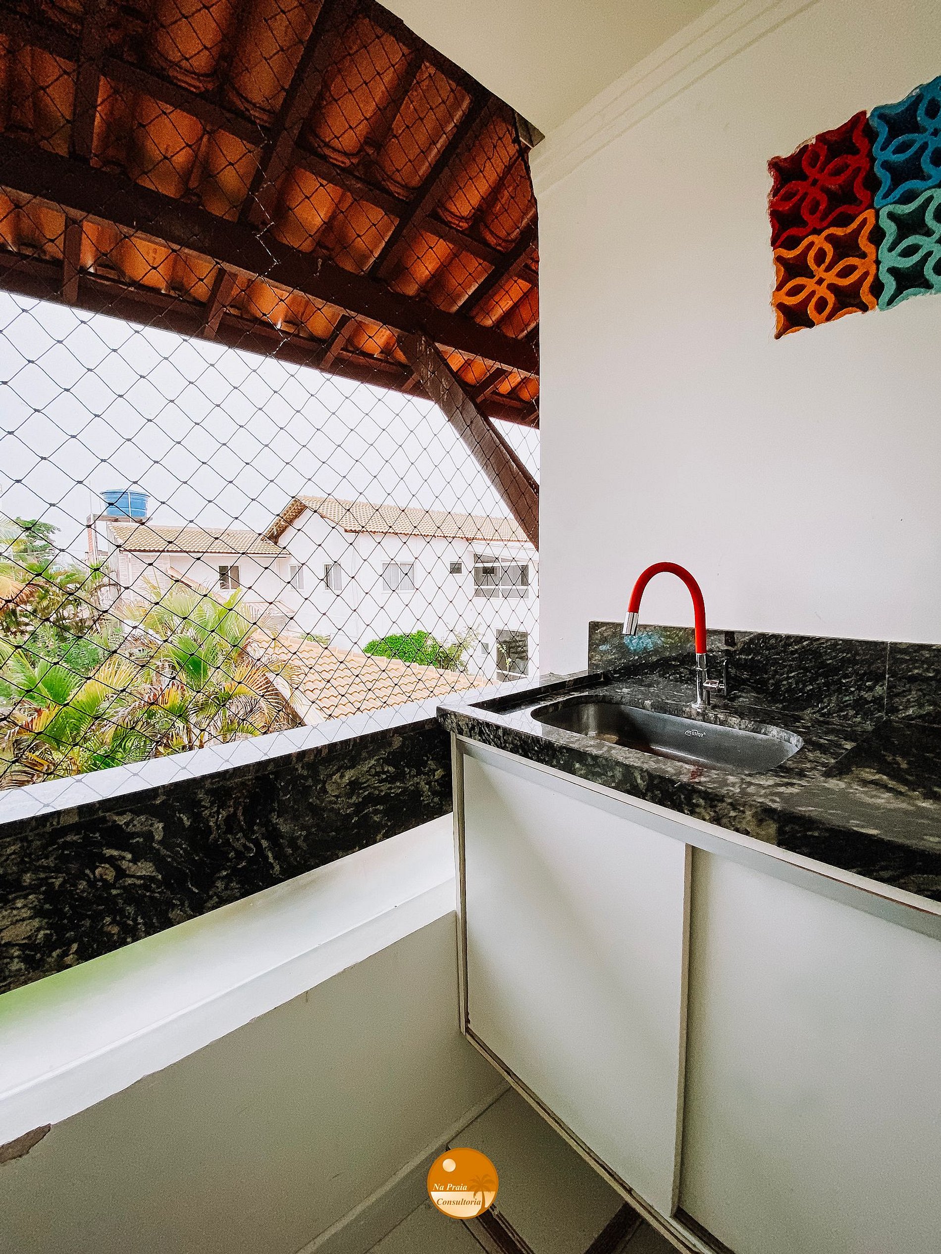 * Varanda: Pia com torneira, mesa dobrável, 2 cadeiras dobráveis e rede de proteção.