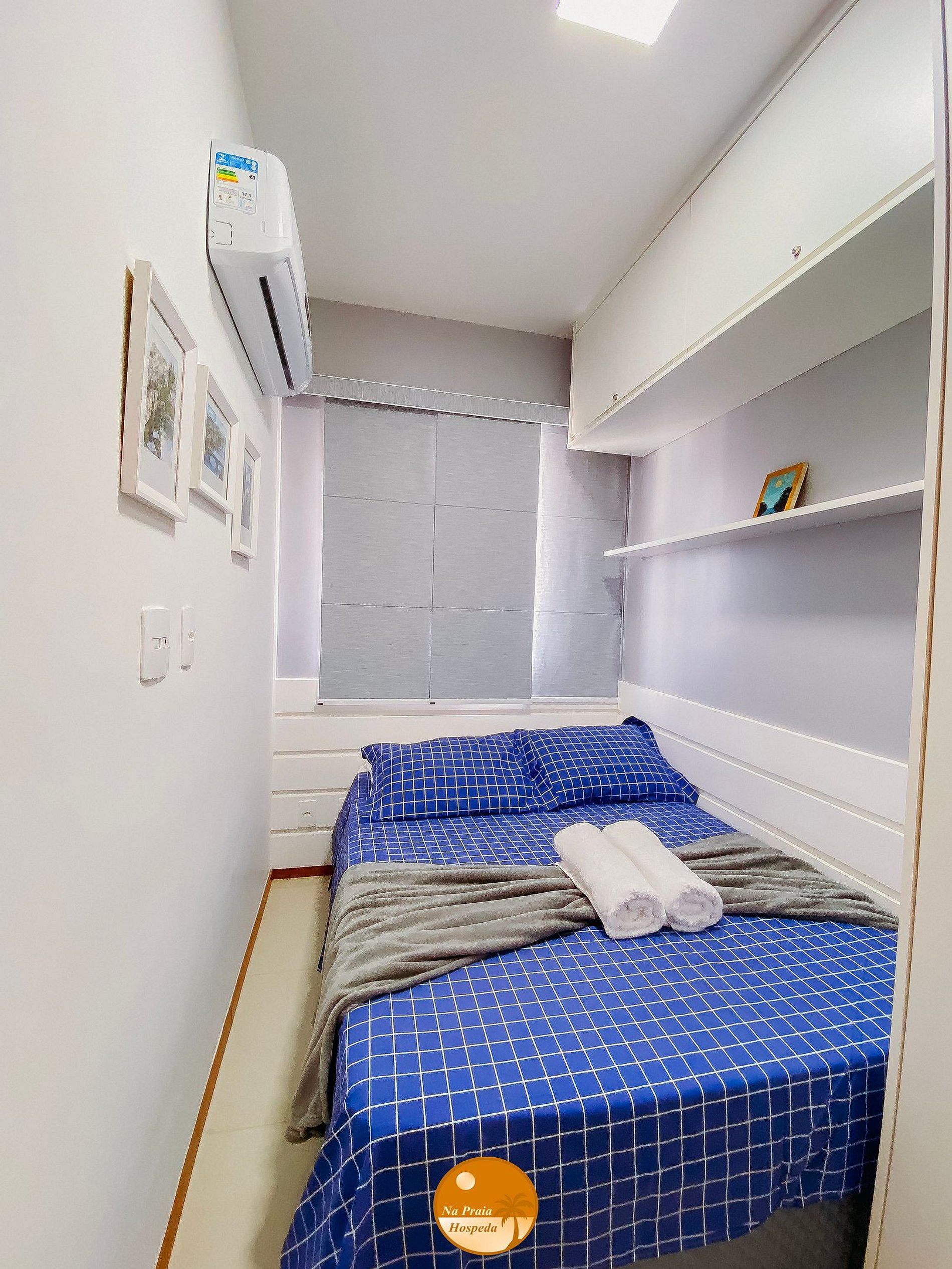 1 Cama de casal, Ar condicionado Split, guarda roupas, janelas com cortinas blackout e tela de proteção.