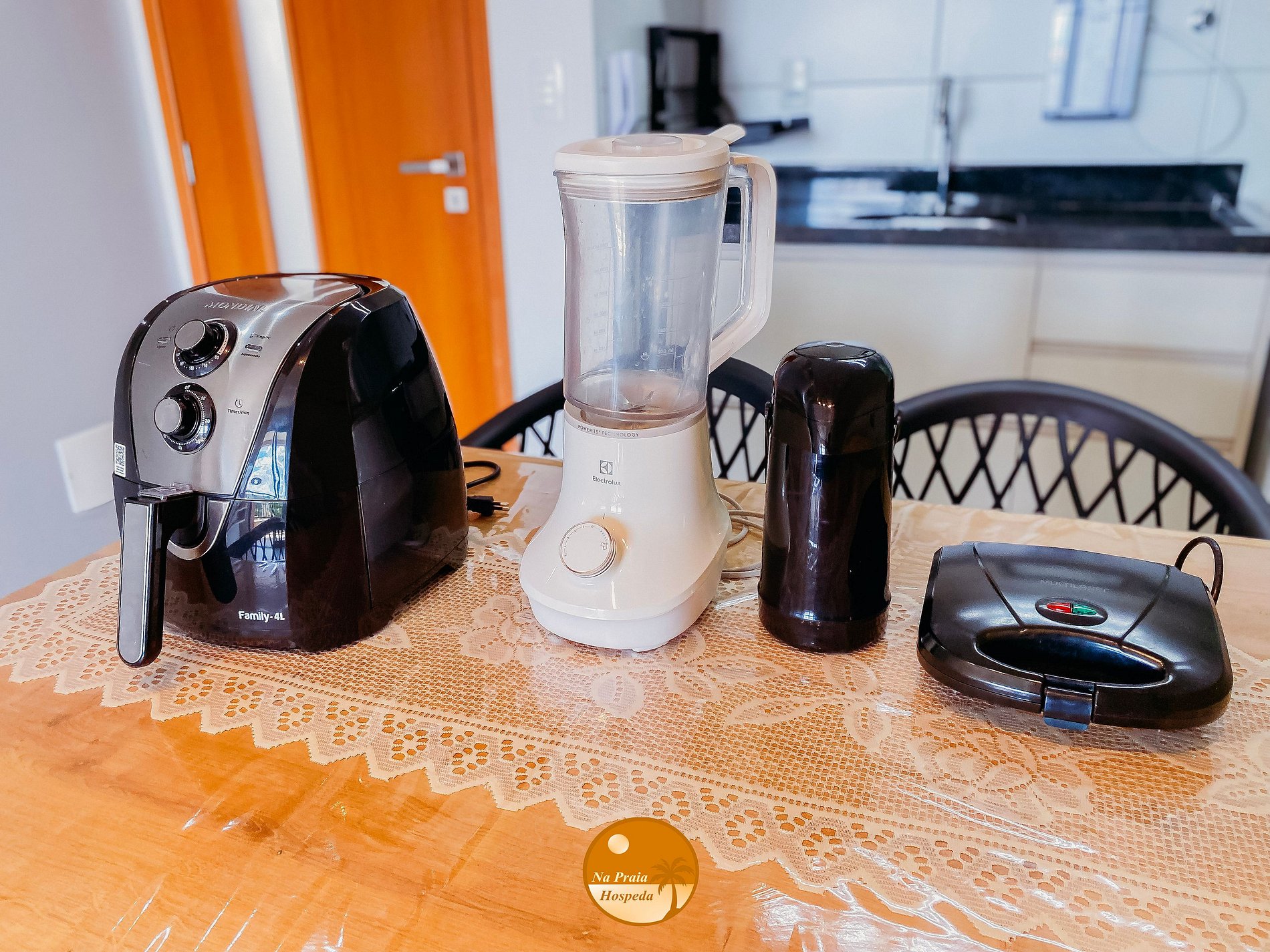 * Cozinha: Totalmente equipada, microondas, sanduicheira, air fryer, liquidificador, purificador de água, geladeira com congelador, fogão 4 bocas e Forno.