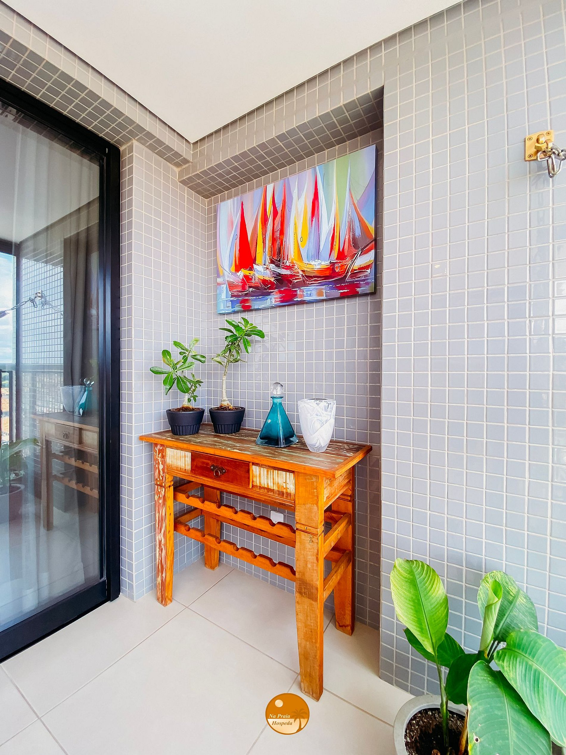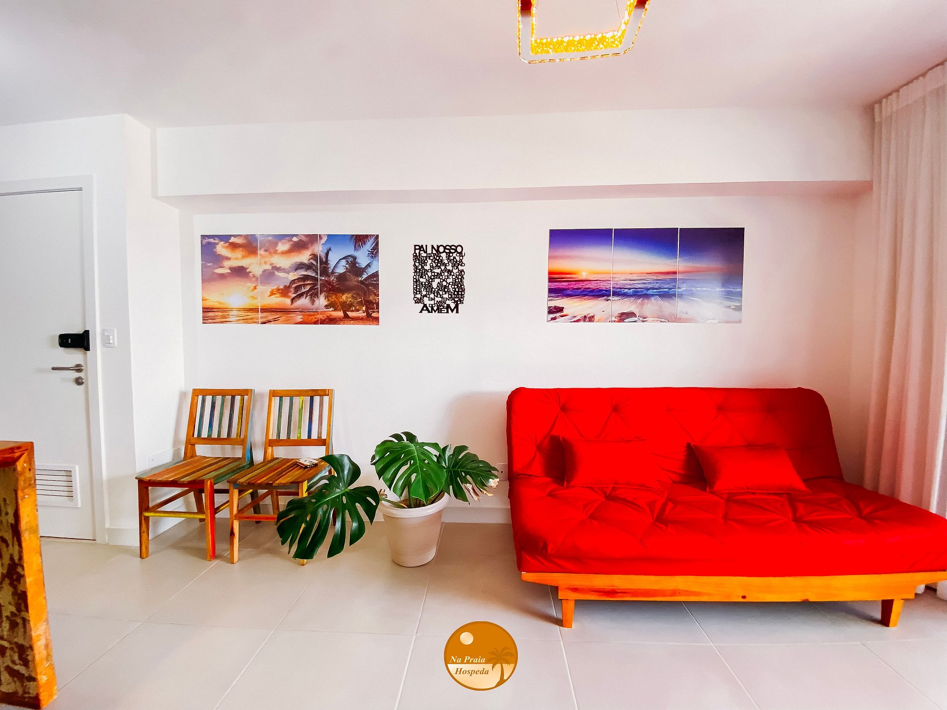 Entrada com fechadura eletrônica, bancada com 2 lugares + 2 cadeiras, Smart TV, Rack, Ventilador de Torre, Sofá cama, Cortina blackout e acesso à varanda com vista para as dunas.