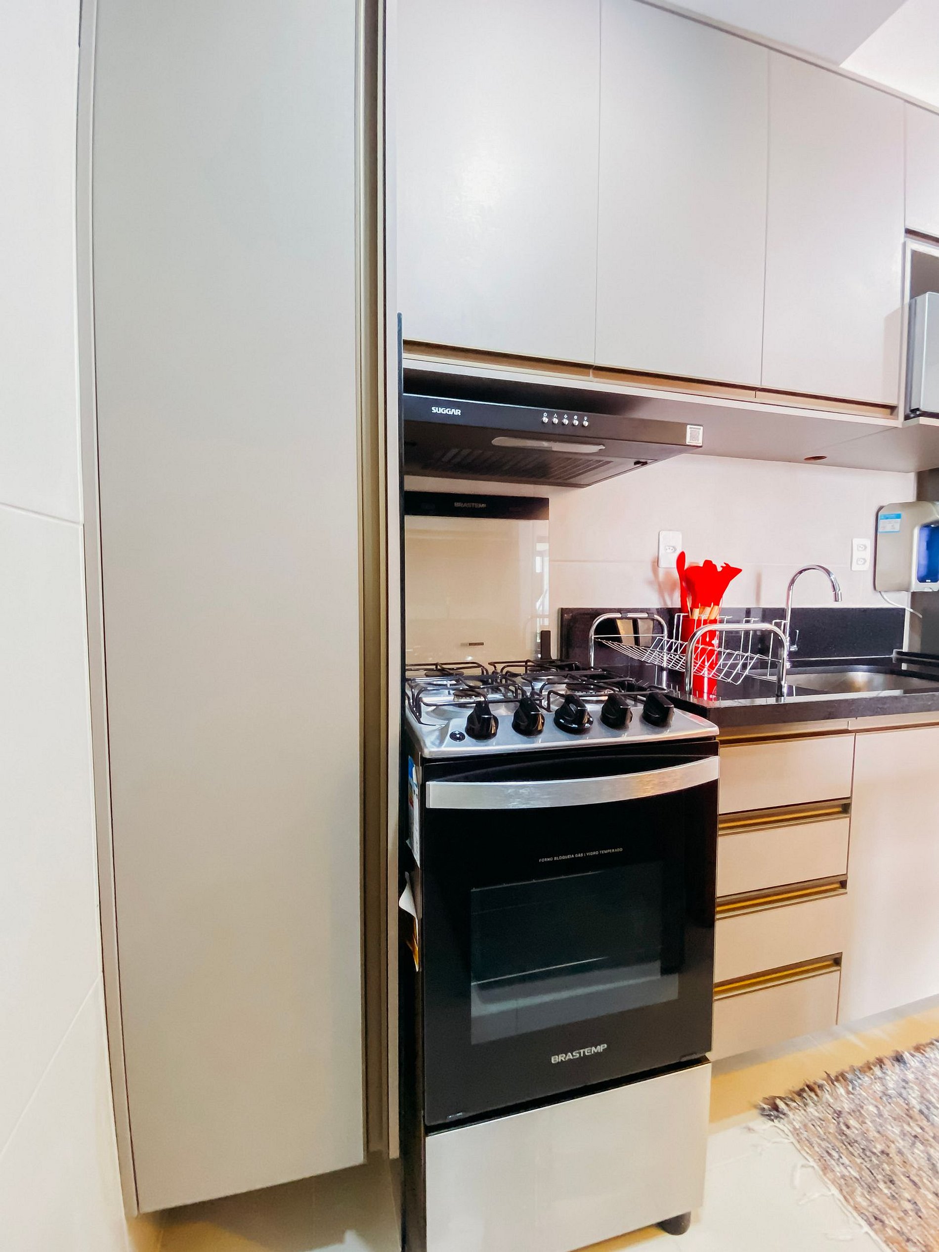 Totalmente equipada com itens básicos (xícaras, panelas, copos, talheres, taças, pratos e talheres), Microondas, Sanduicheira, Liquidificador, Air Fryer, Filtro de água, Geladeira com congelador, Fogão com 4 bocas e Forno.