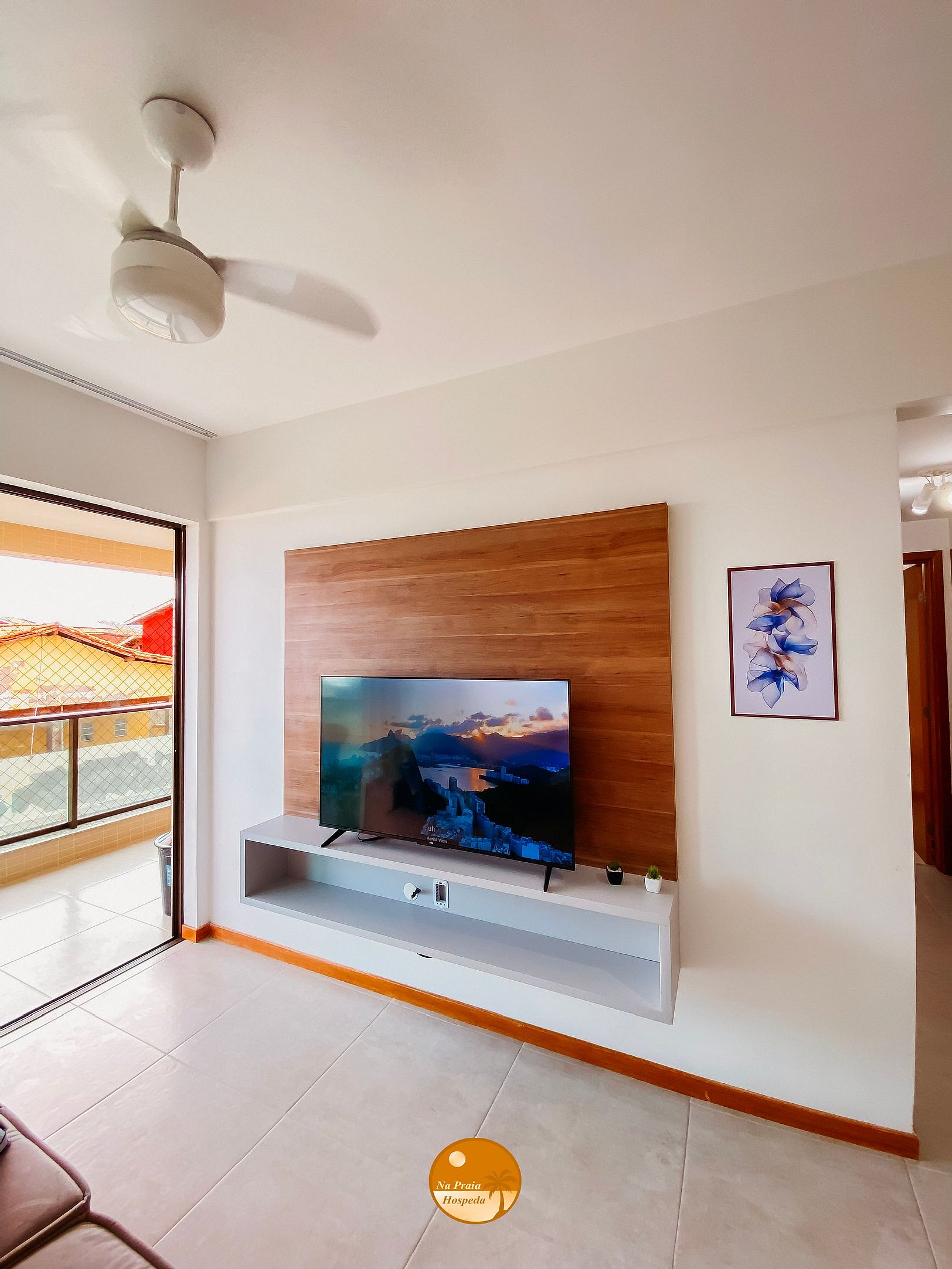 1 double sofa bed, 1 Side table, 1 Bar sideboard, 1 Smart TV, Rack, Games and Cards, Hutch cabinet, Glasses for drinks, Bench with two high stools, Split air conditioning and Access to the balcony.