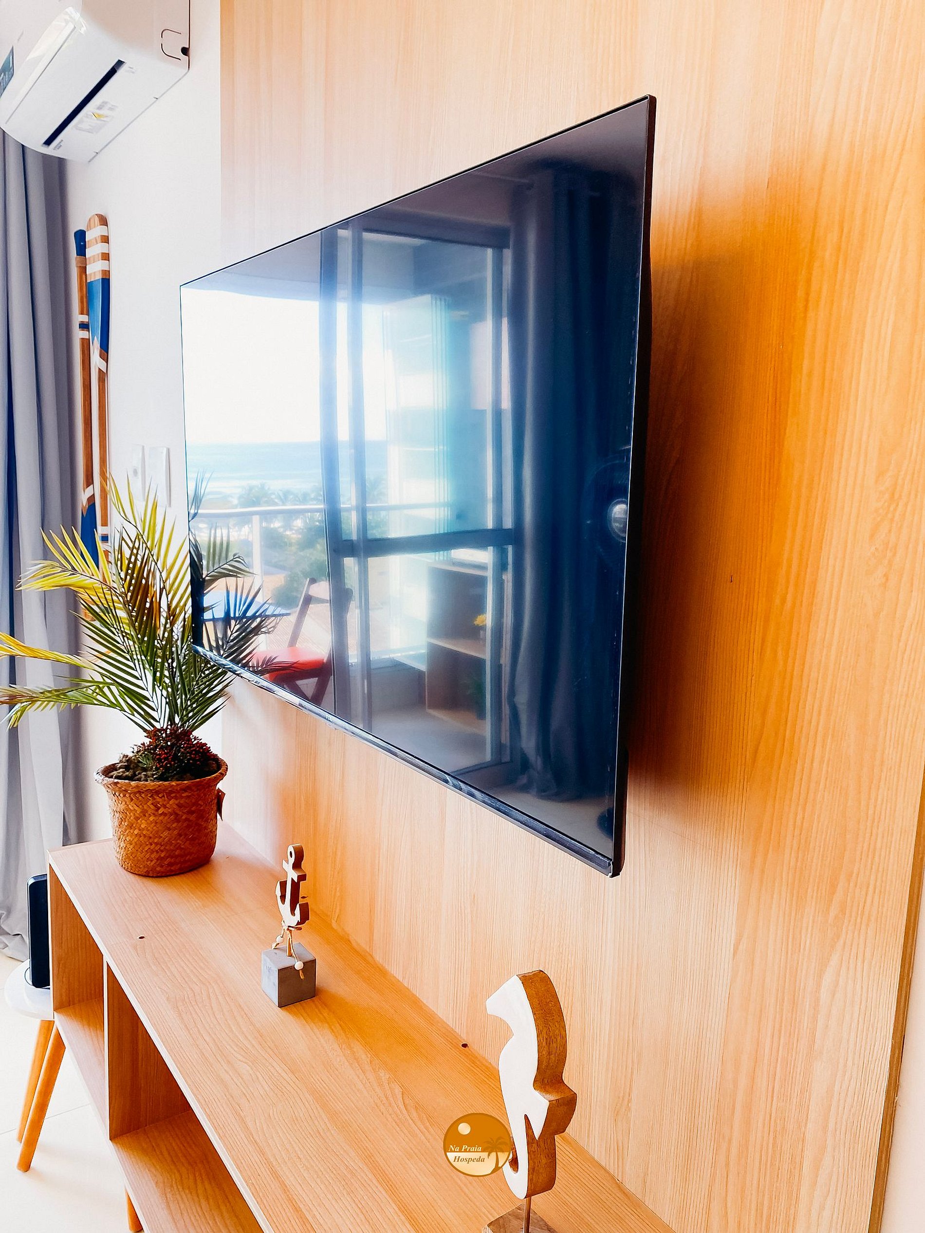 Entrada com fechadura eletrônica, Mesa com 4 lugares, Smart TV, Sofá cama, Ar condicionado, Ventilador de torre, Cortina Blackout e Acesso à varanda.