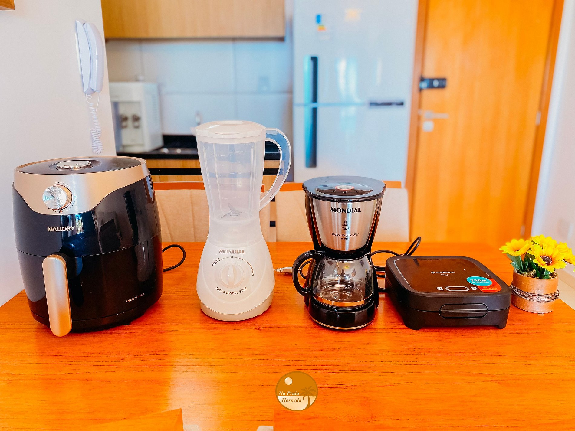 Totalmente equipada, Microondas, Geladeira com congelador, Liquidificador, Sanduicheira, Purificador de água, Air Fryer, Cafeteira, Fogão com 4 bocas e Forno.