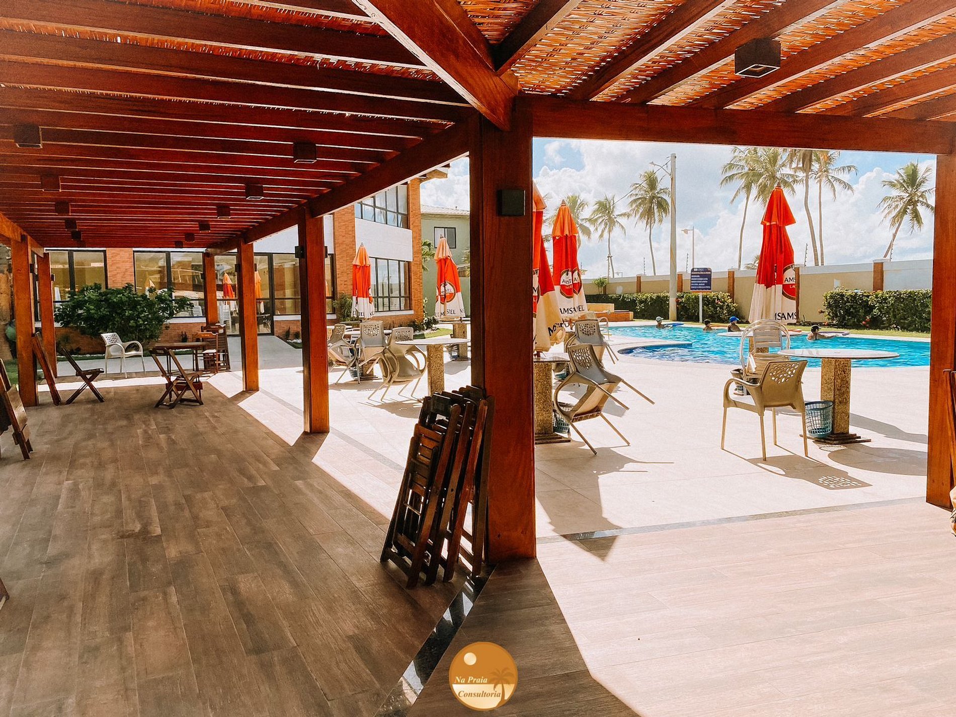 * Estrutura com mesas, cadeiras, guarda sóis, espreguiçadeiras