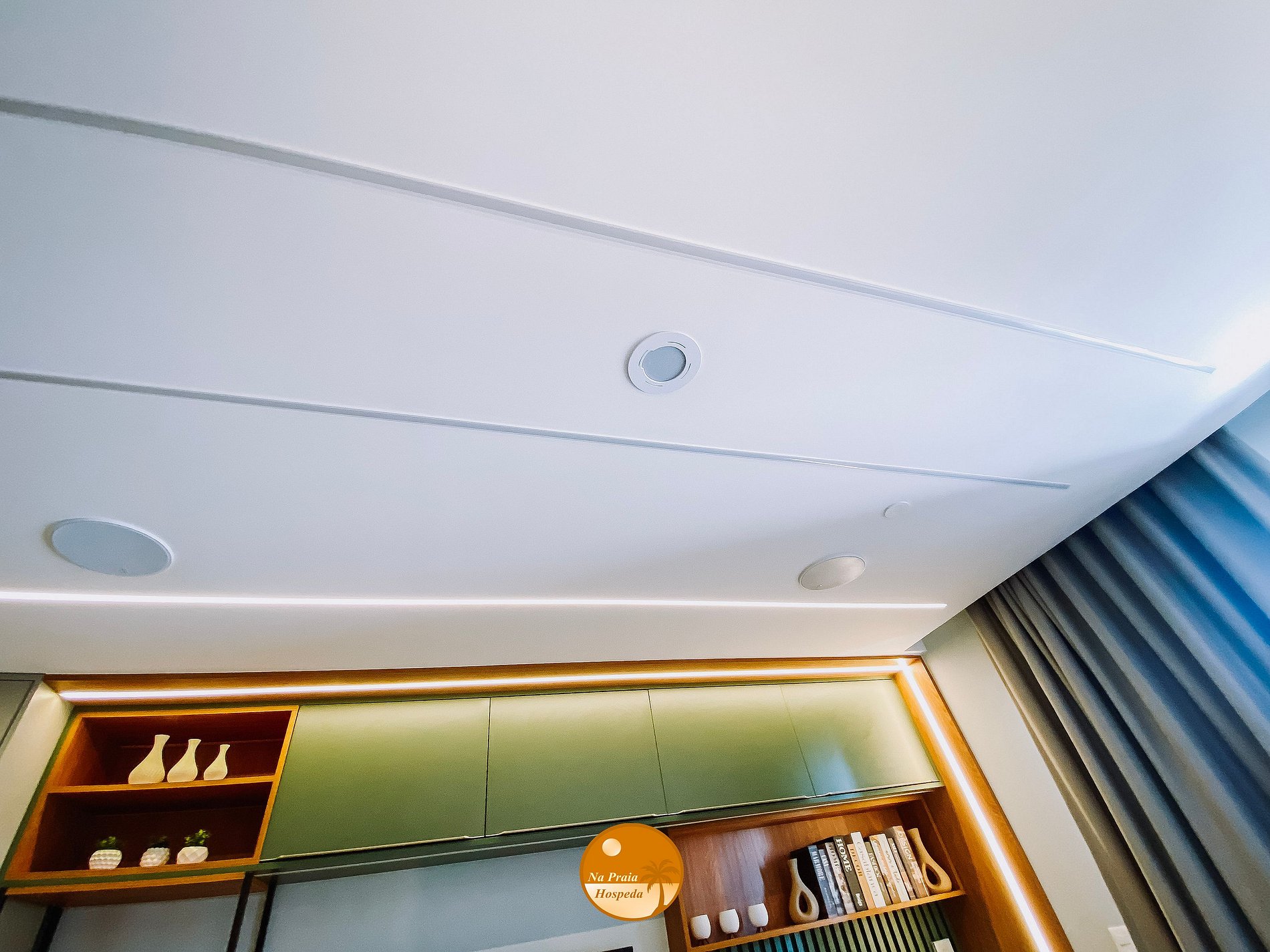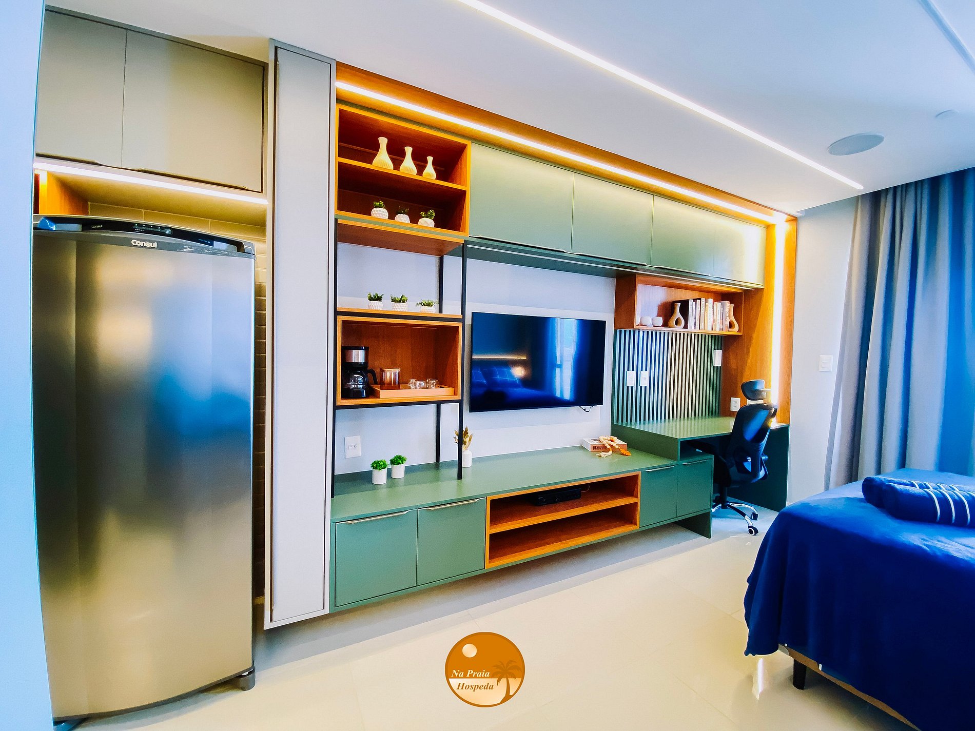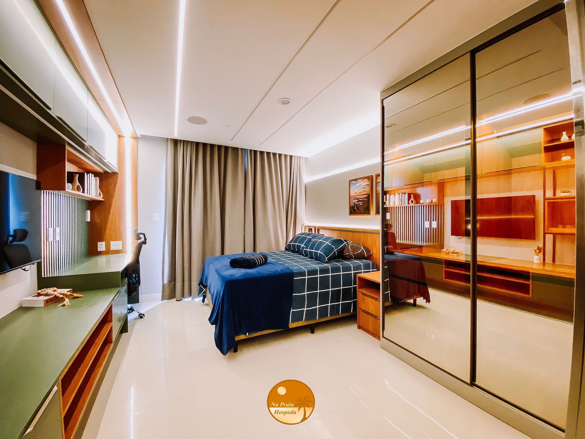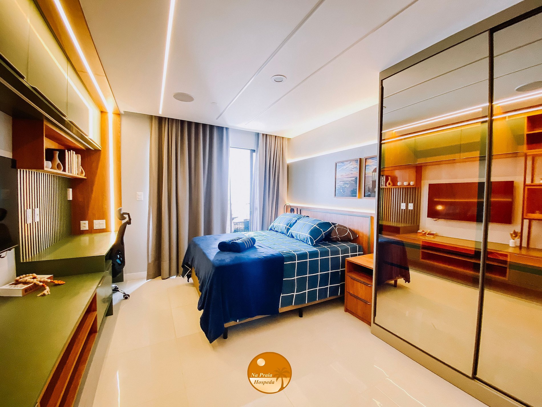 - 1 cama casal, Alexa com sistema de som no teto, Smart Tv (login e senha do próprio hóspede), espaço de trabalho, guarda roupas, ar-condicionado, cortina blackout automatizada, varanda com vista mar e wi-fi.