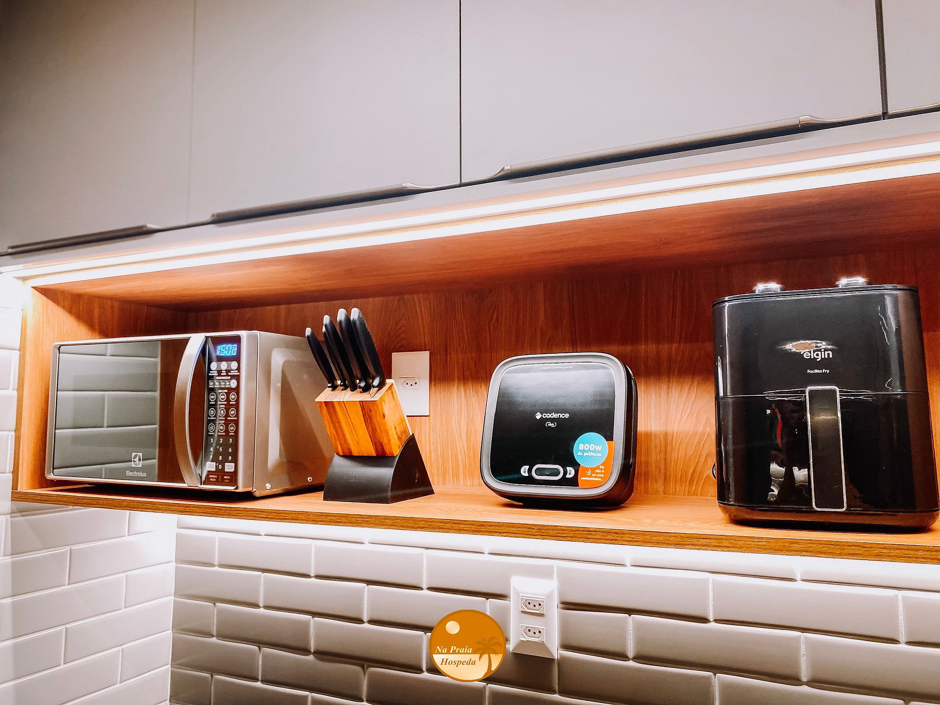- Cozinha completa com geladeira, fogão de 2 bocas cooktop por indução, cafeteira, microondas, air fryer, sanduicheira, panelas, louças e utensílios;