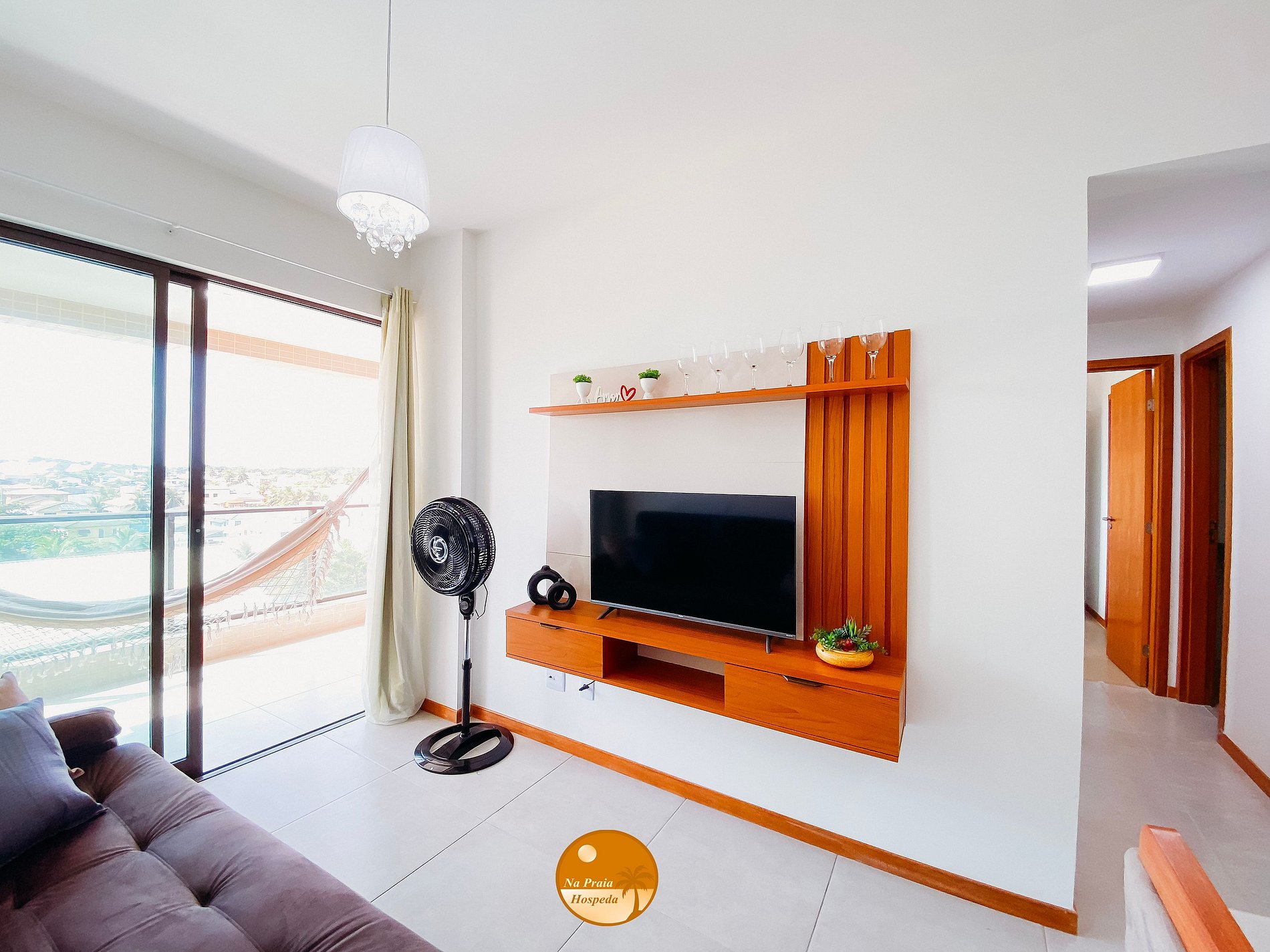 * Sala de Estar/Jantar: 1 sofá cama, Smart TV, Rack, Ventilador de torre, Varanda com mesa + Quatro cadeiras, Rede de descanso.