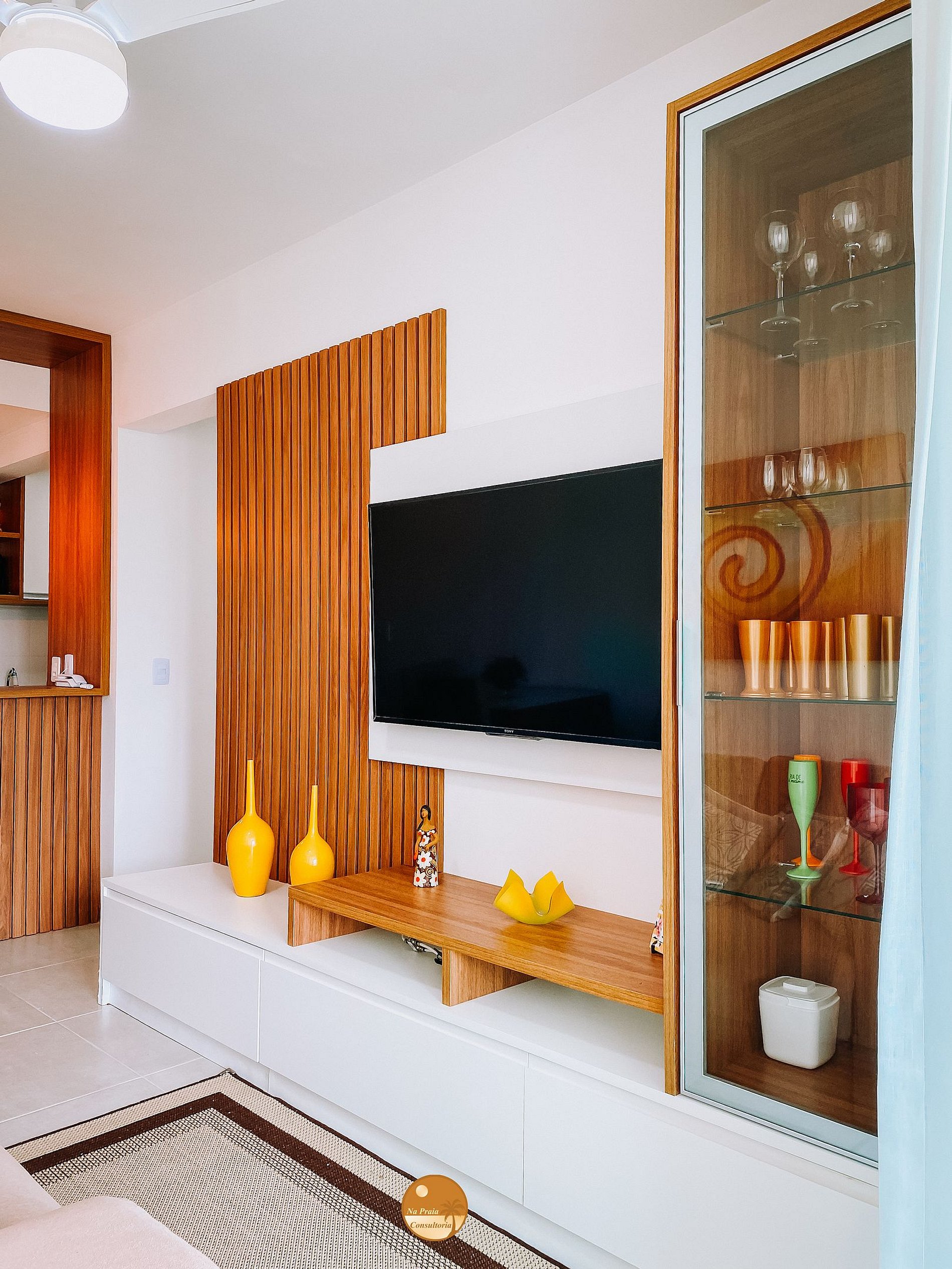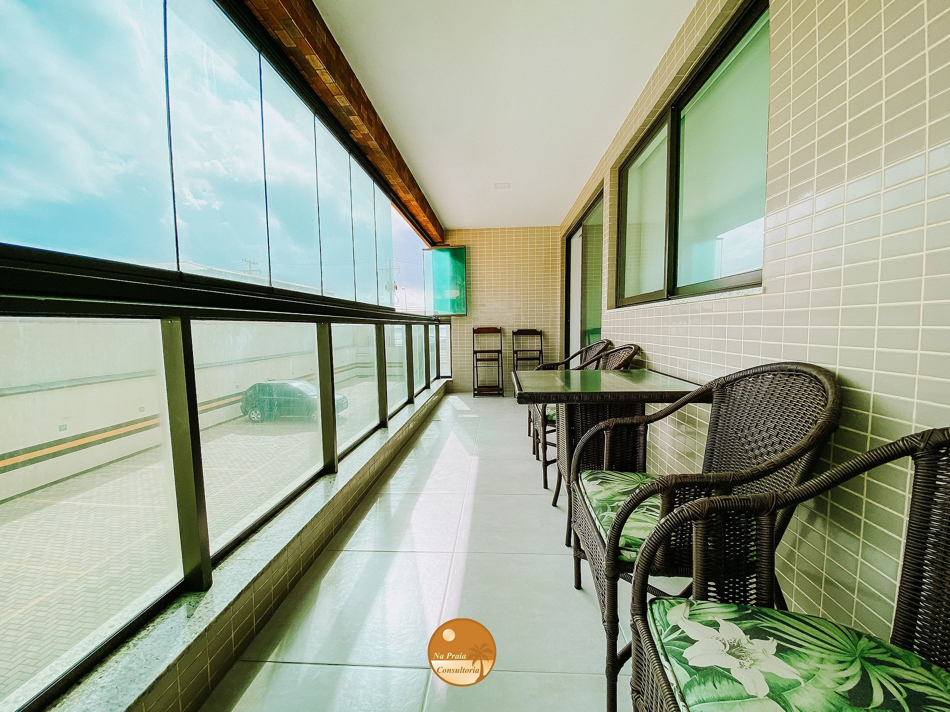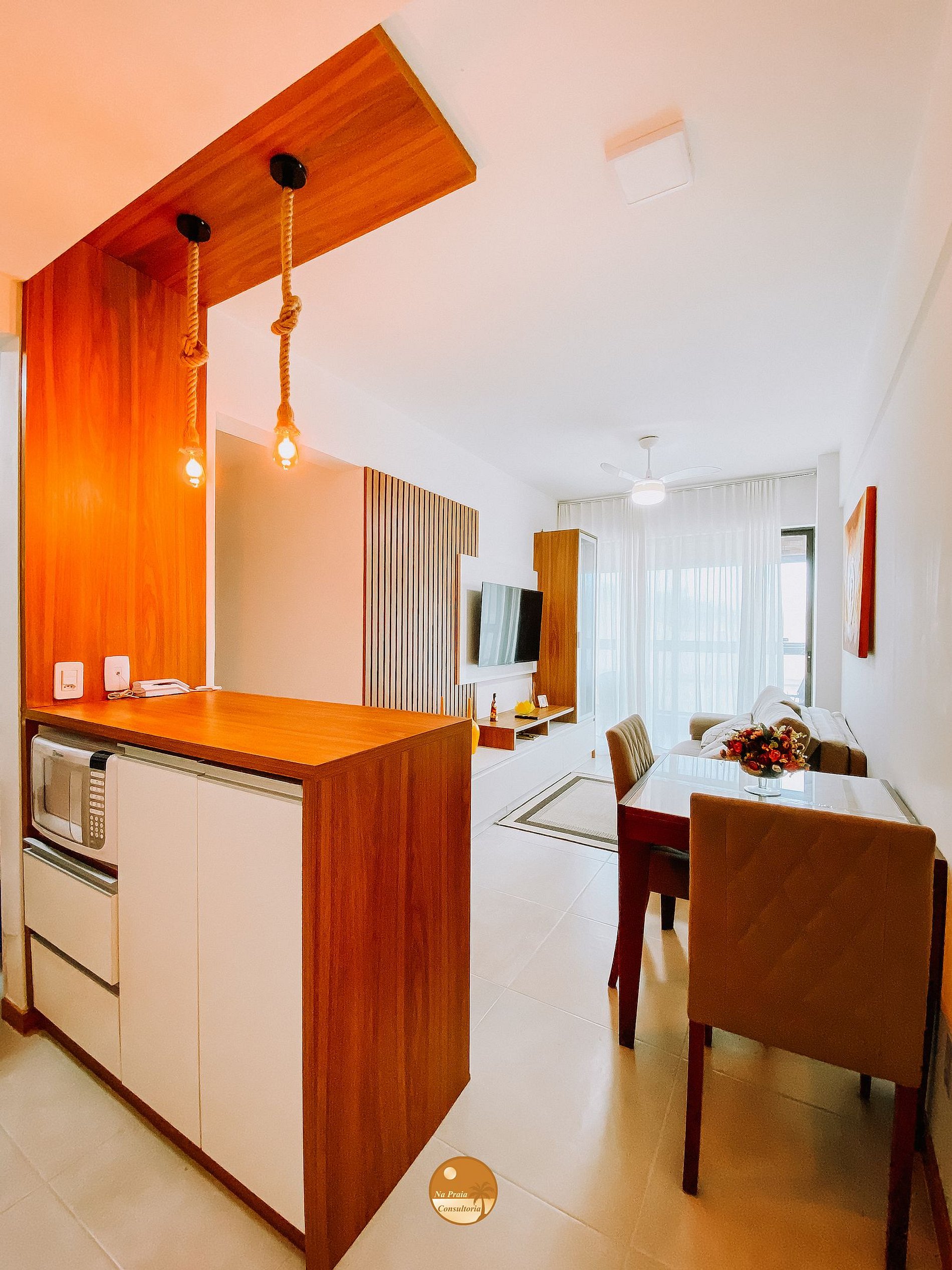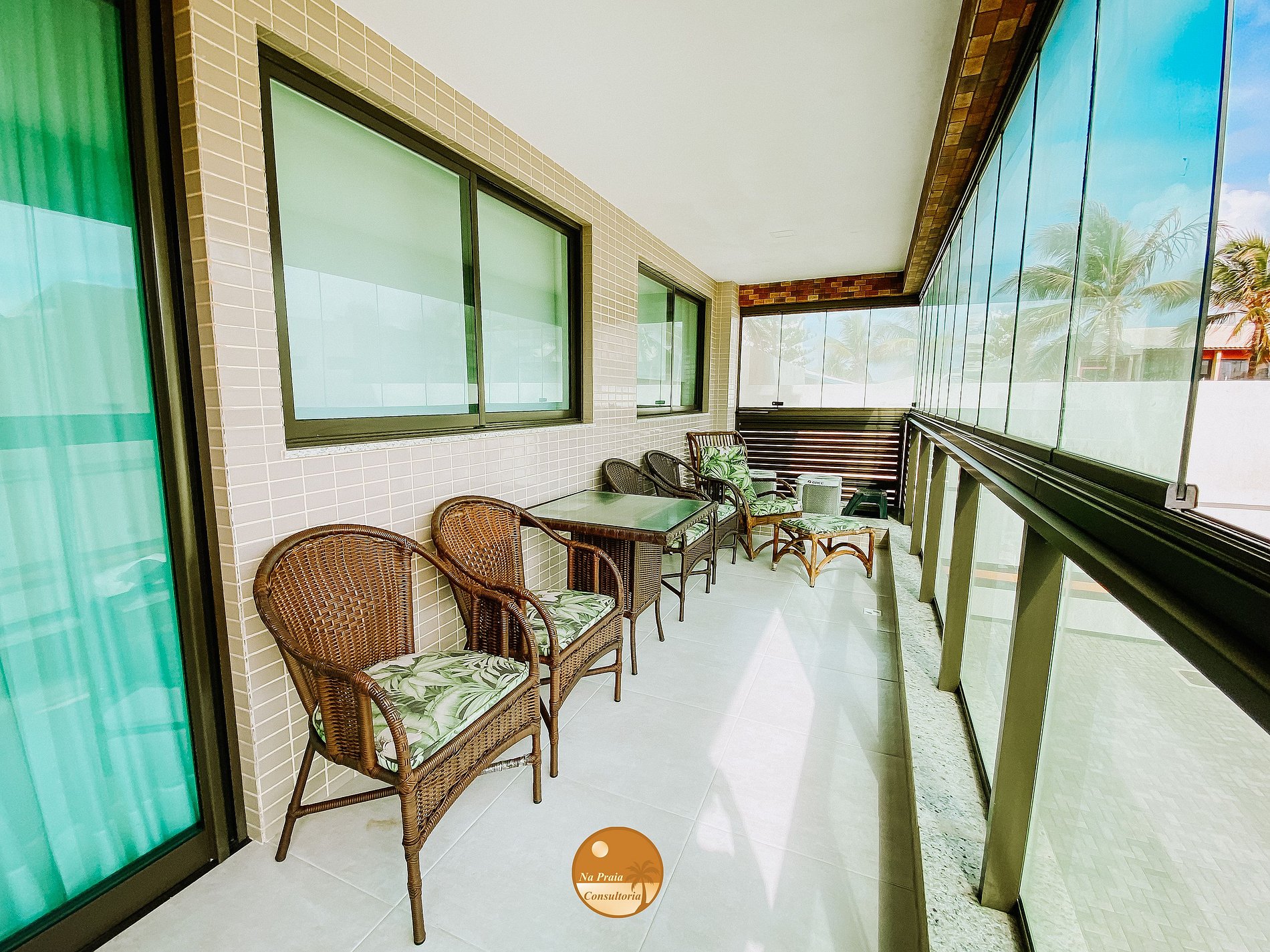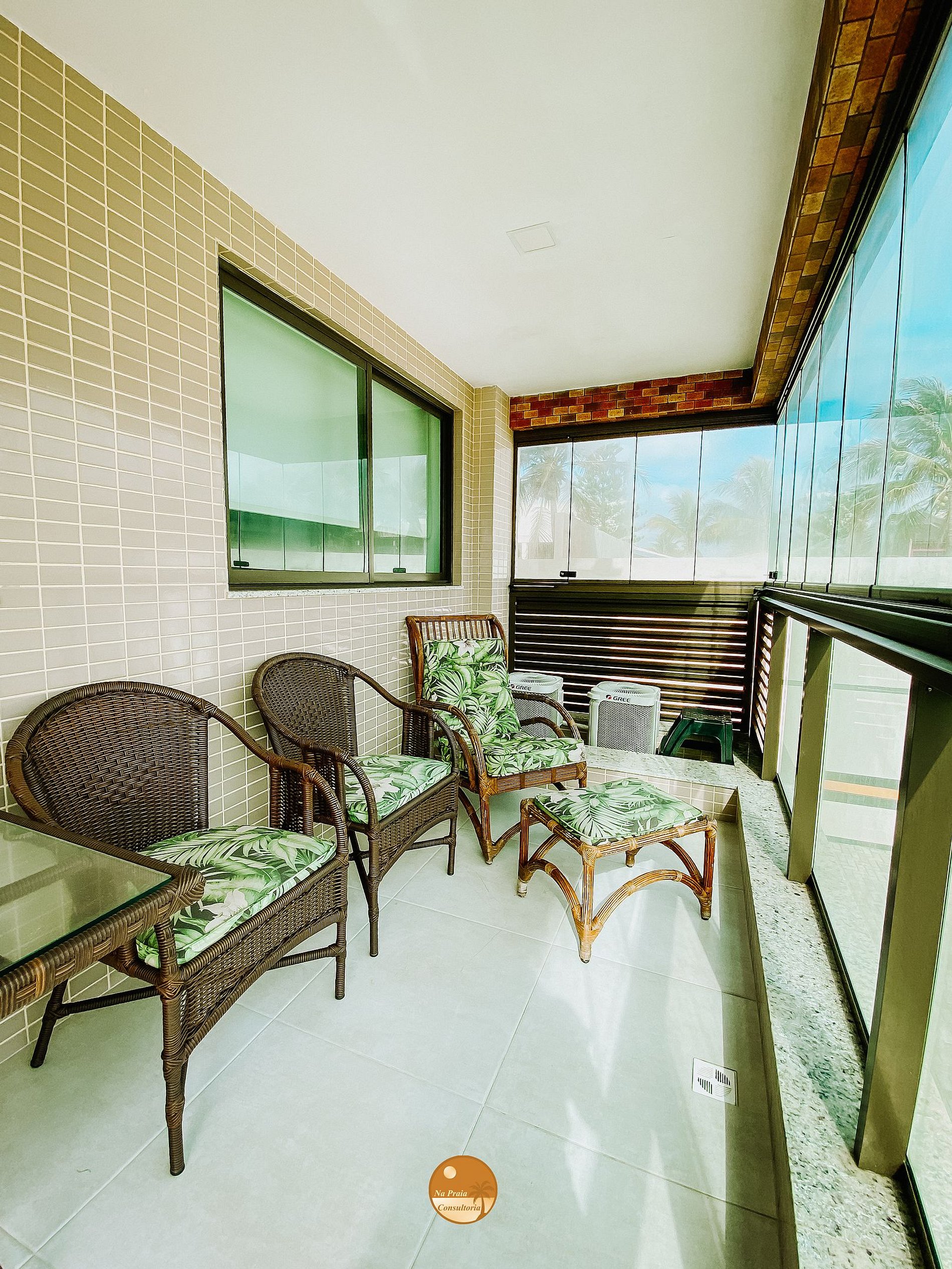 * Sala de Estar/Jantar: 1 sofá cama, Smart TV, rack, cristaleira, Taças para bebidas, Varanda com mesa + Duas cadeiras + Quatro poltronas + Uma poltrona com apoio de pés e Mesa de jantar com duas cadeiras.