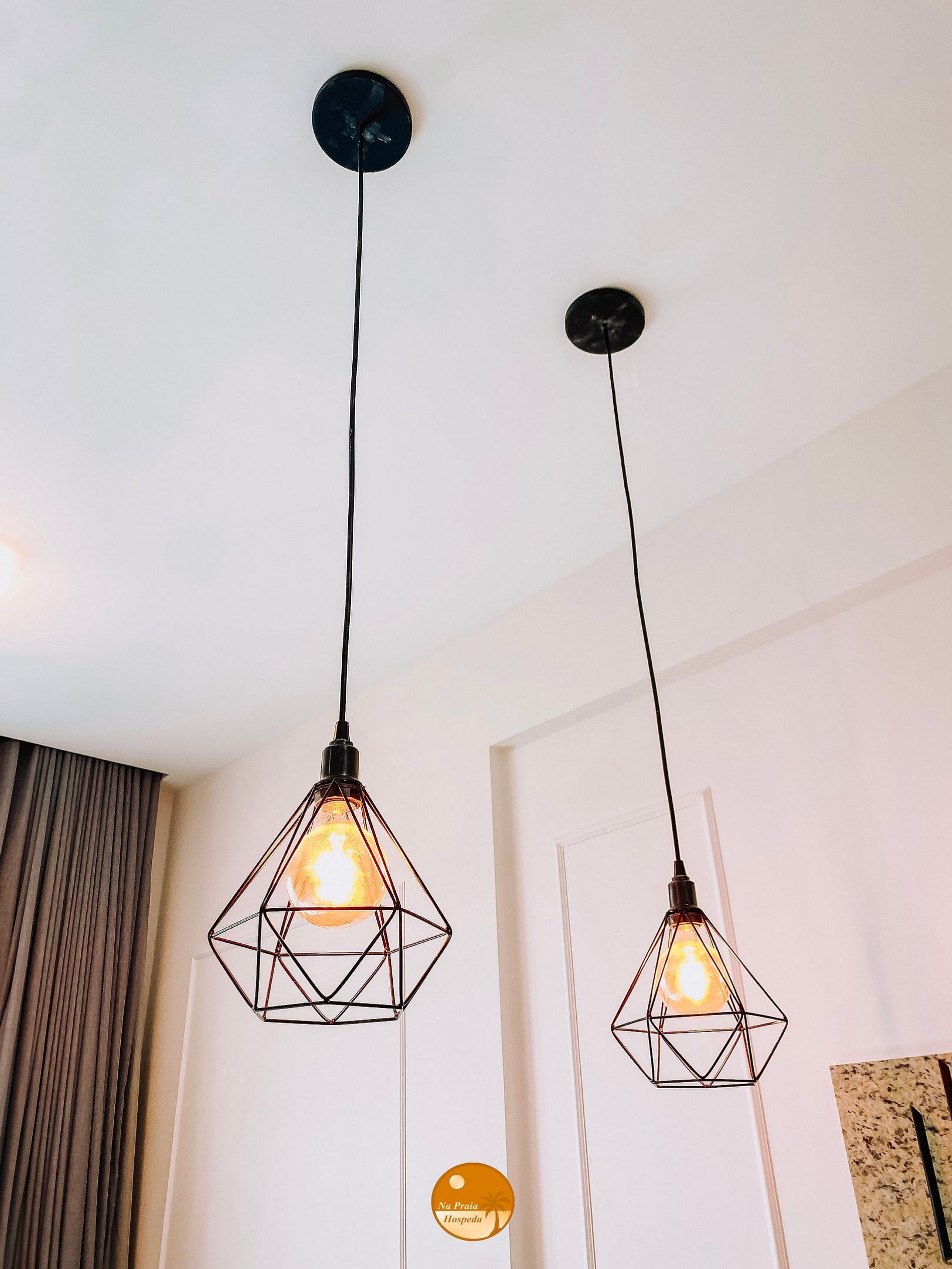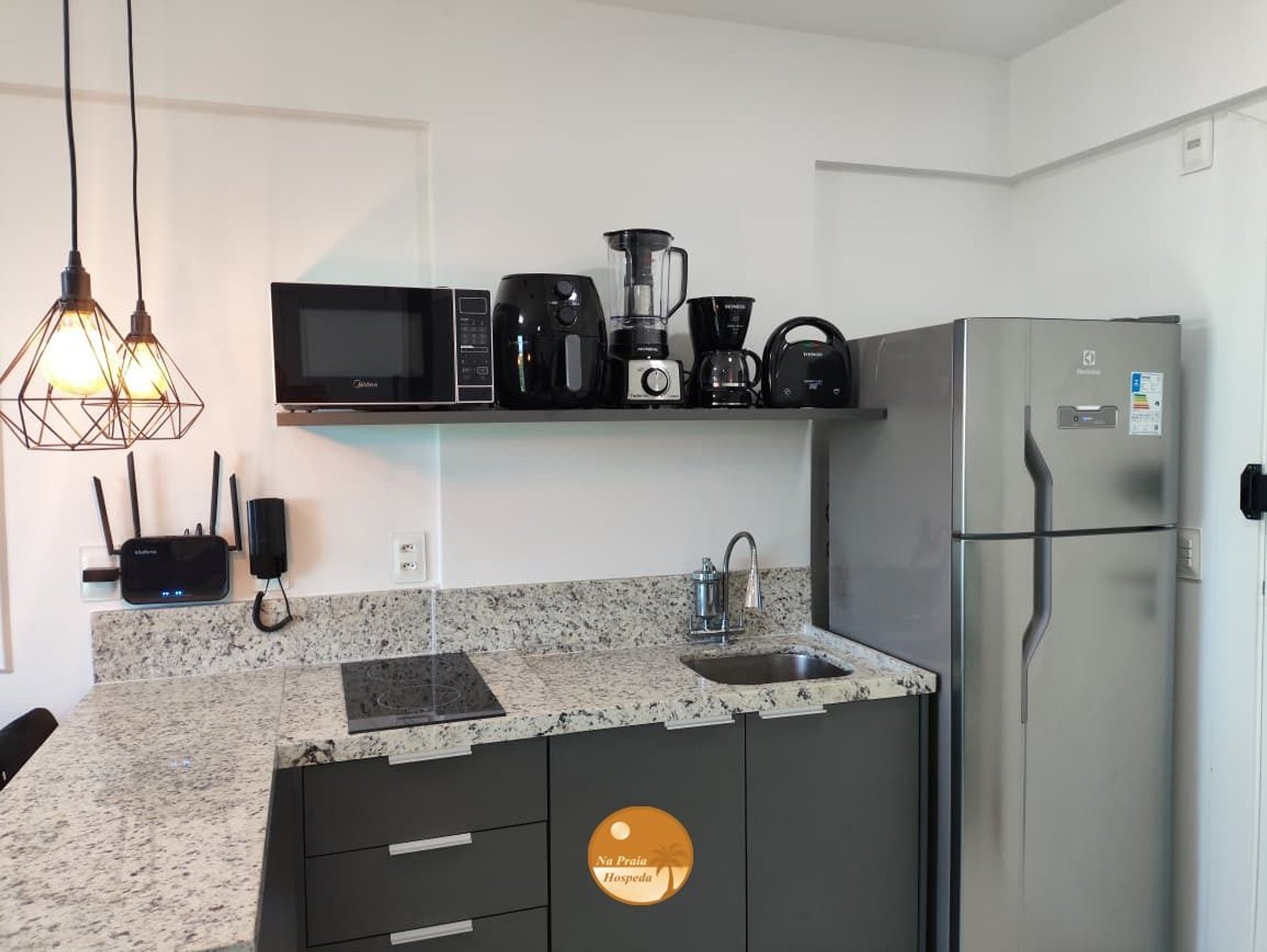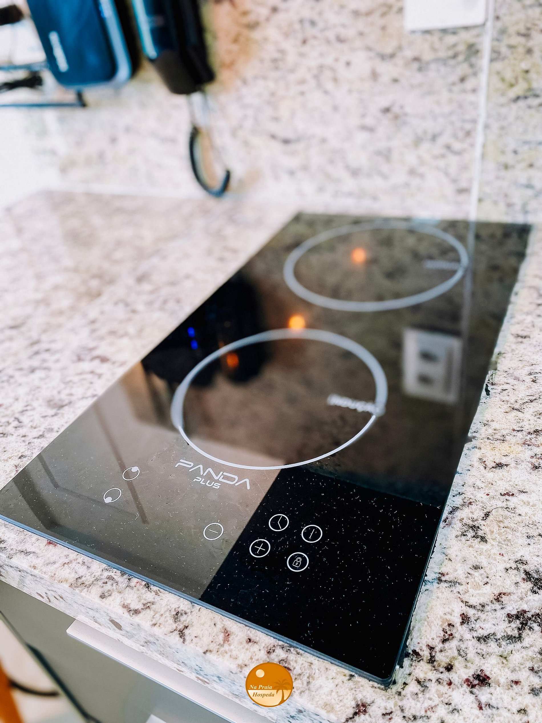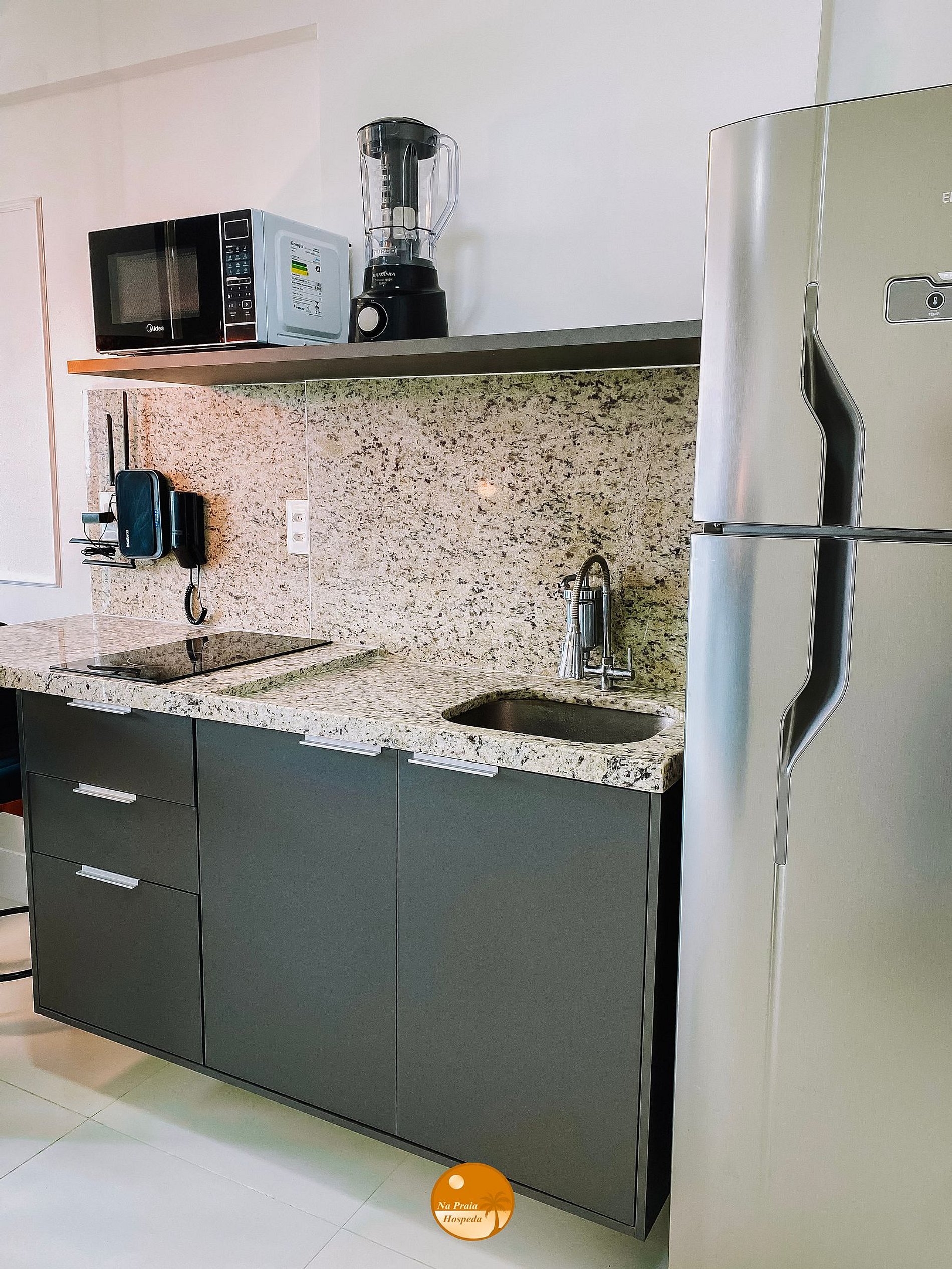 - Cozinha completa com geladeira, fogão de 2 bocas cooktop por indução, microondas, air fryer, sanduicheira, liquidificador, panelas, louças e utensílios;
