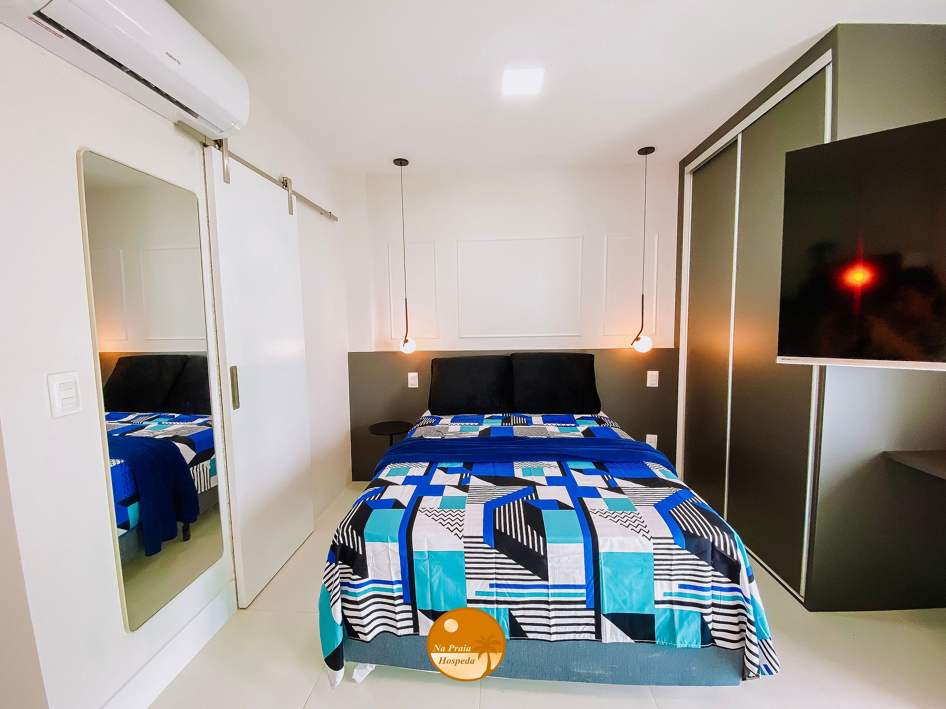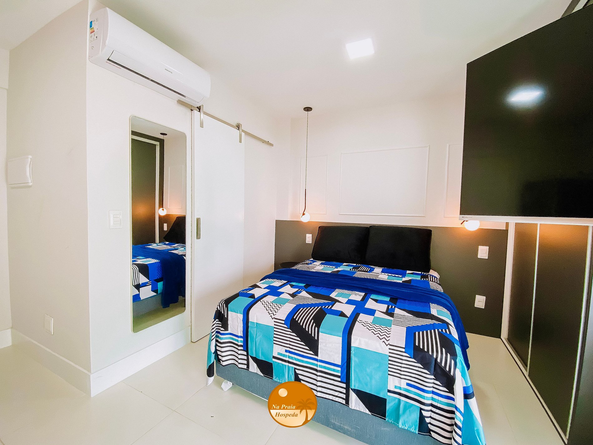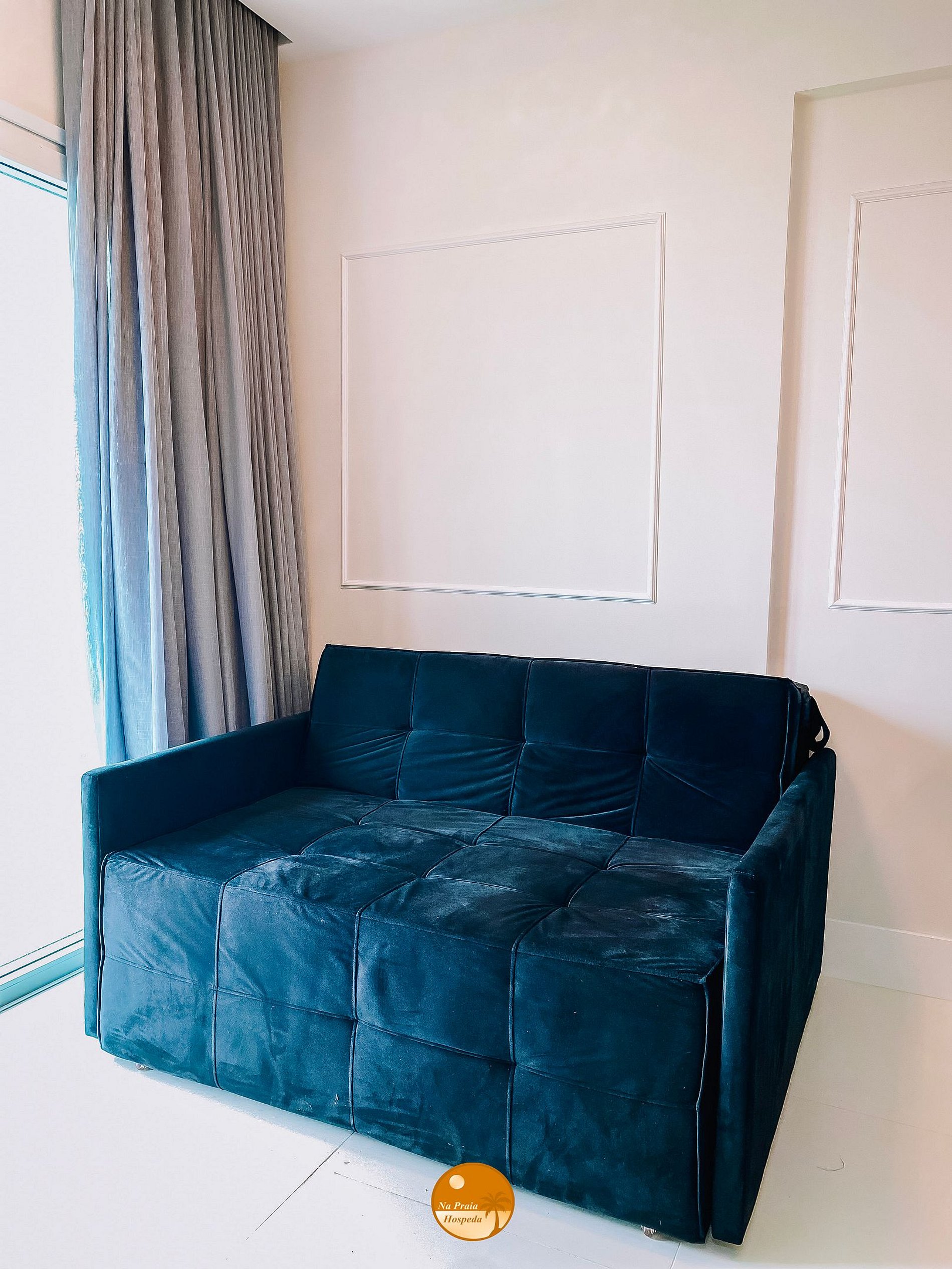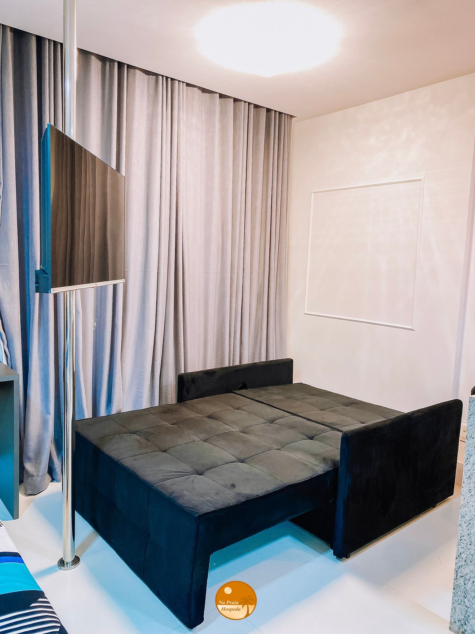 - 1 cama casal, 1 sofá cama de casal, Smart Tv, armário, ar-condicionado, cortina blackout, varanda com vista mar e wi-fi.