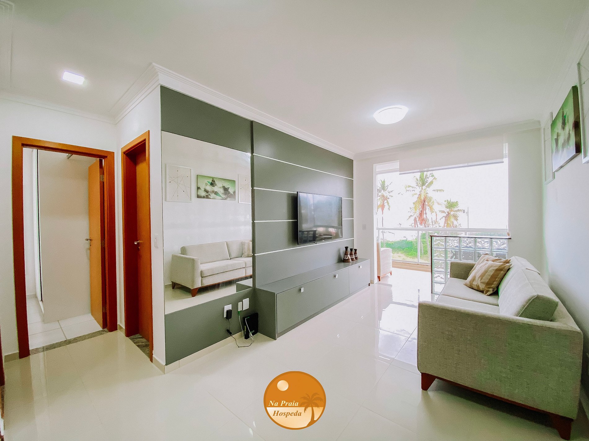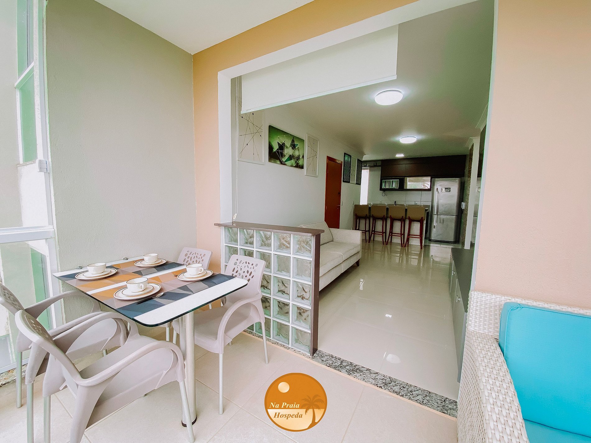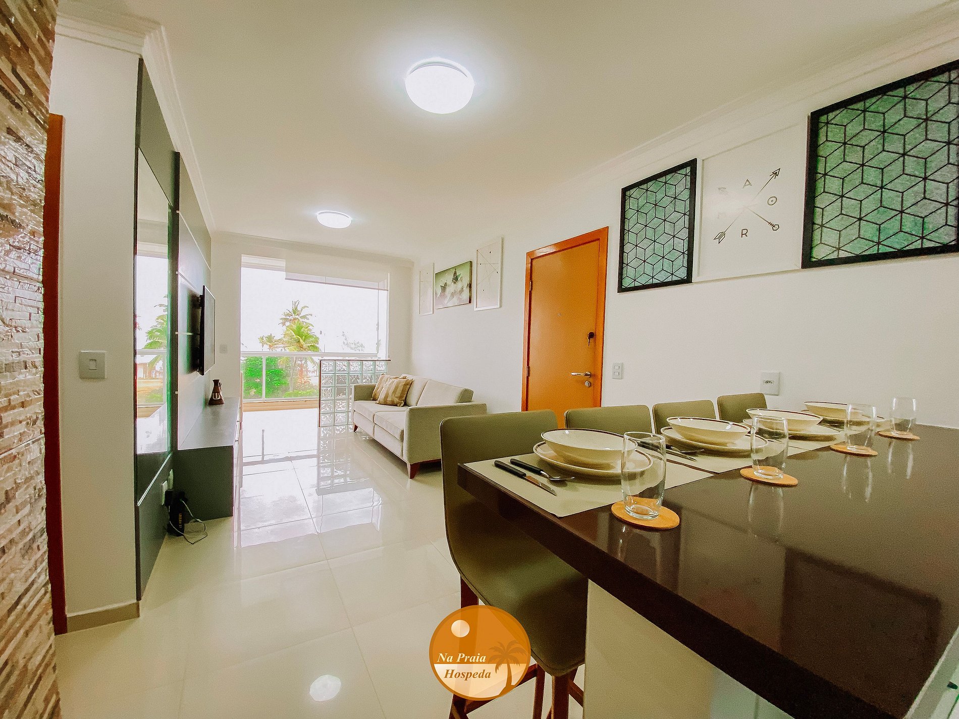 * Sala de Estar/Varanda: Sofá, Smart TV, acesso à varanda, mesa com cadeiras, sofá, varanda com fechamento em vidros.