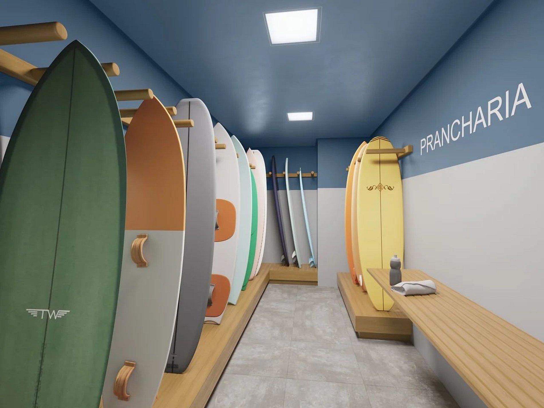 Hóspedes poderão utilizar a piscina, pranchário, bicicletário, espaço coworking, academia e lavanderia.