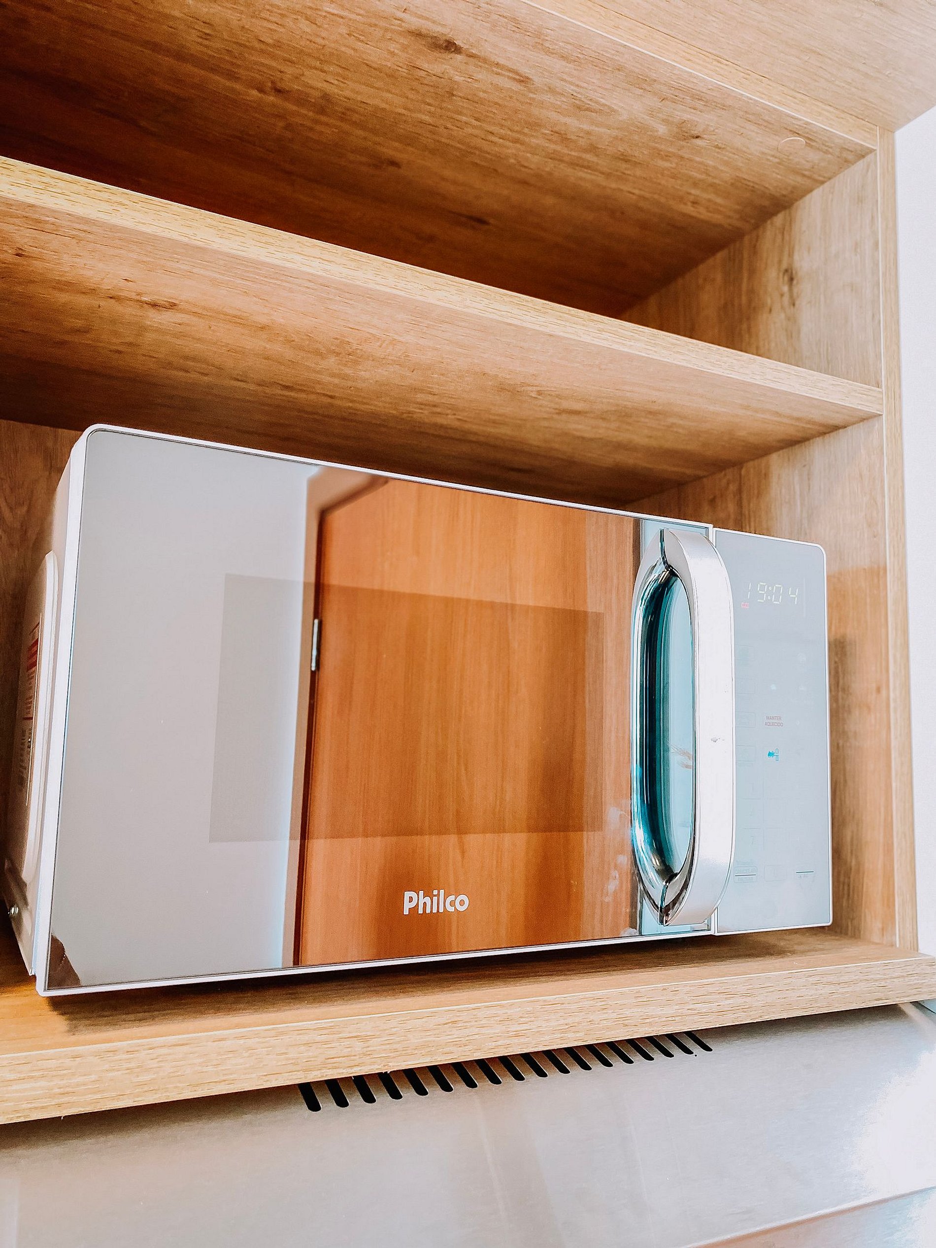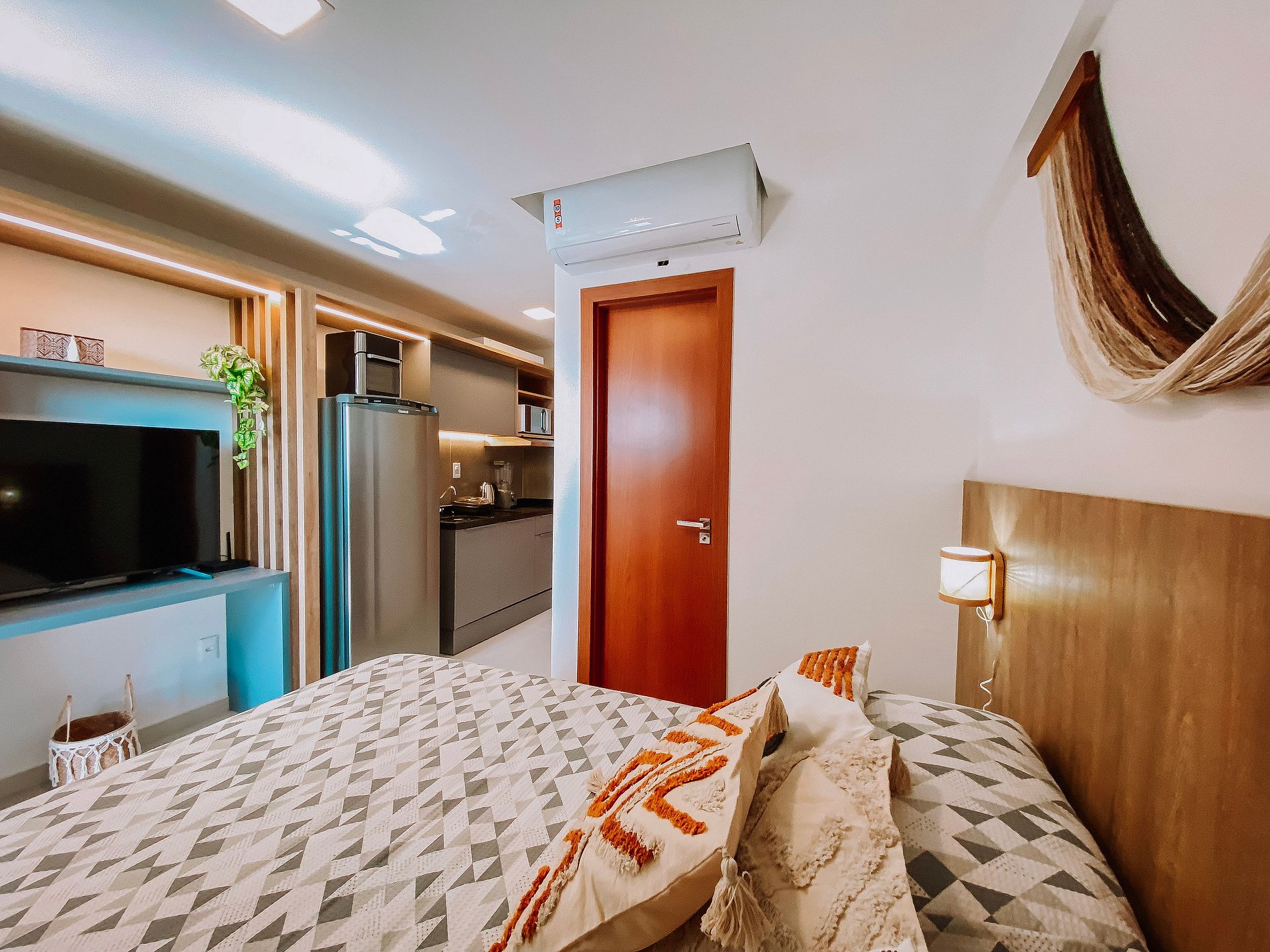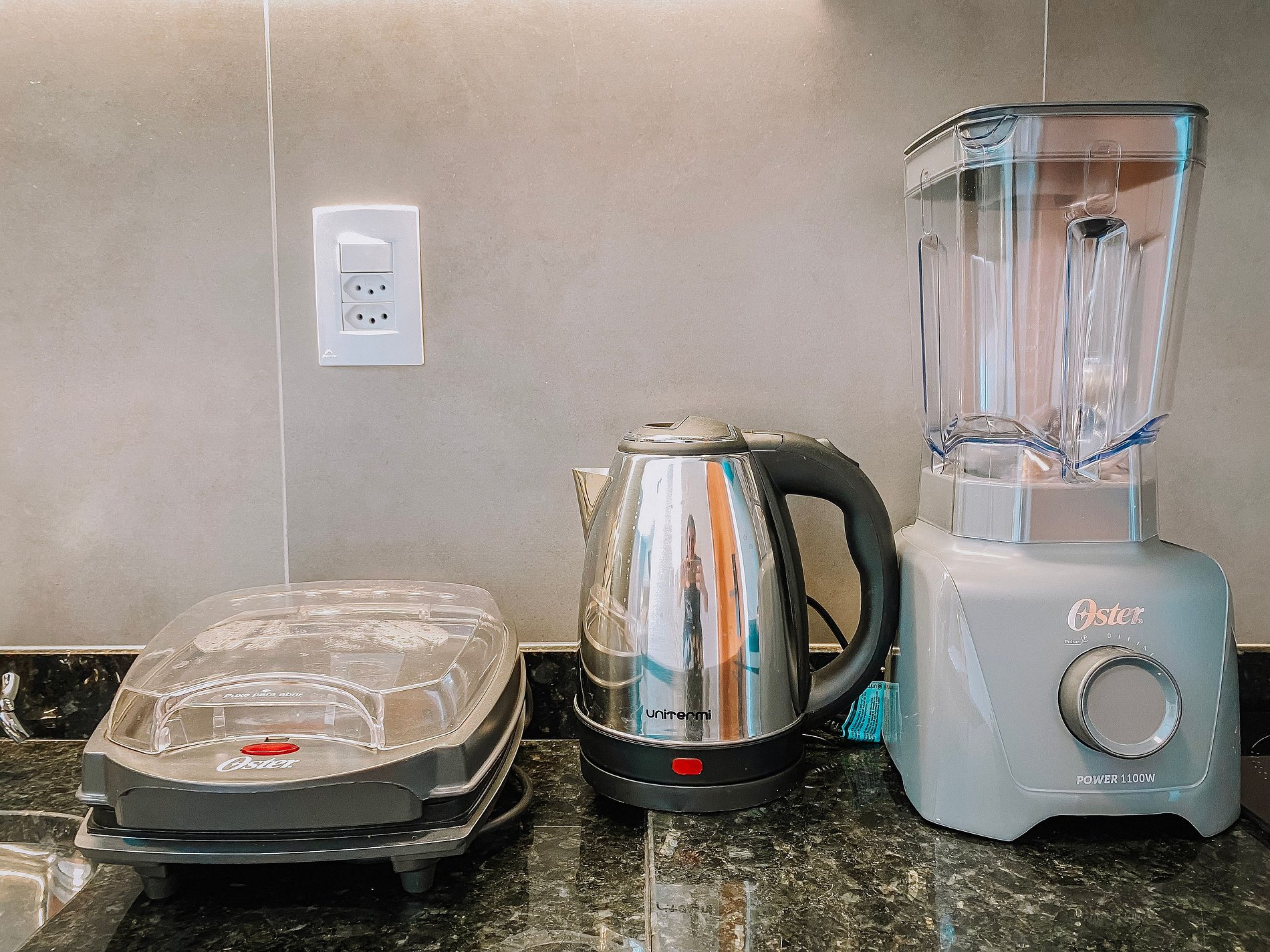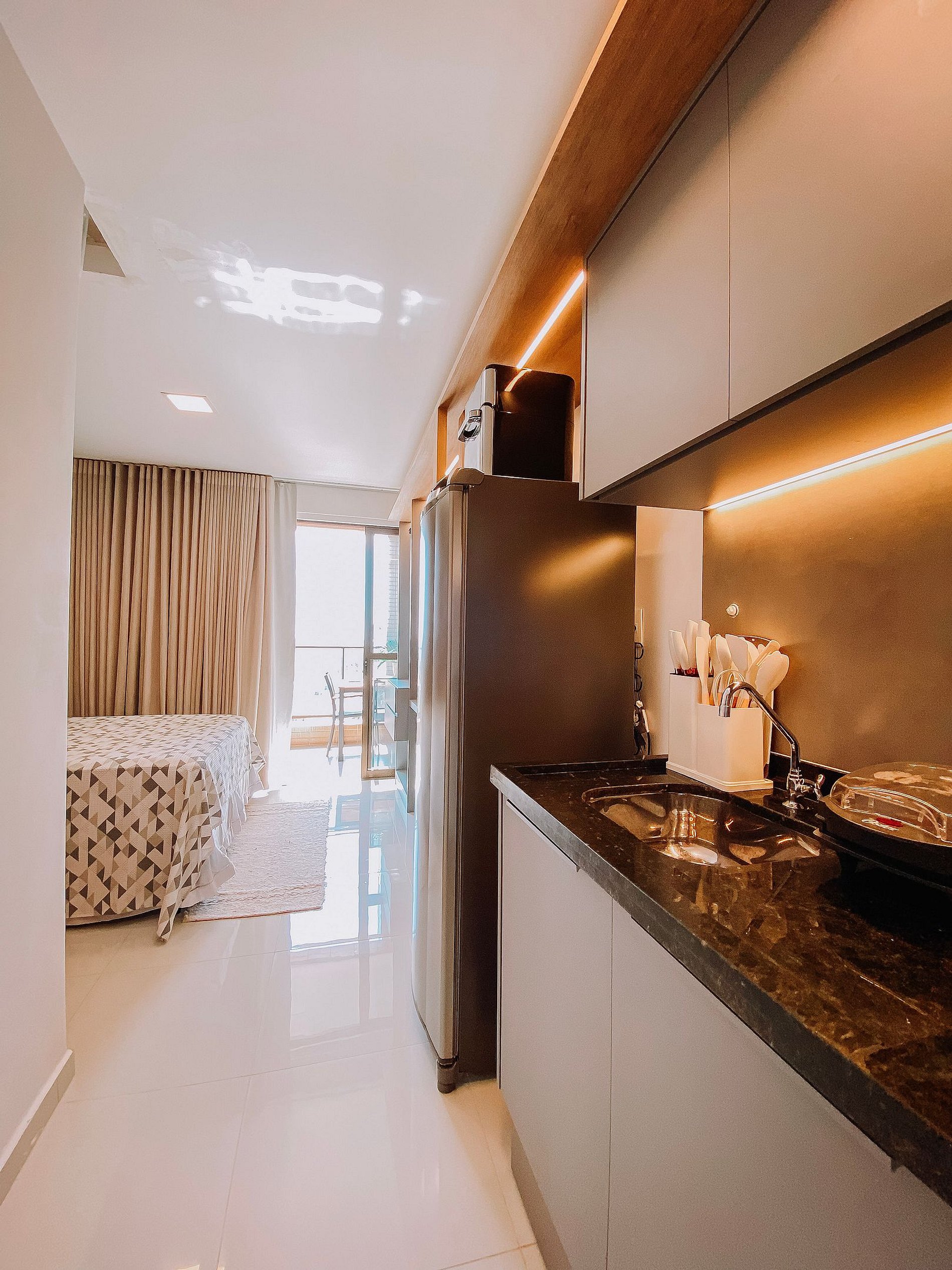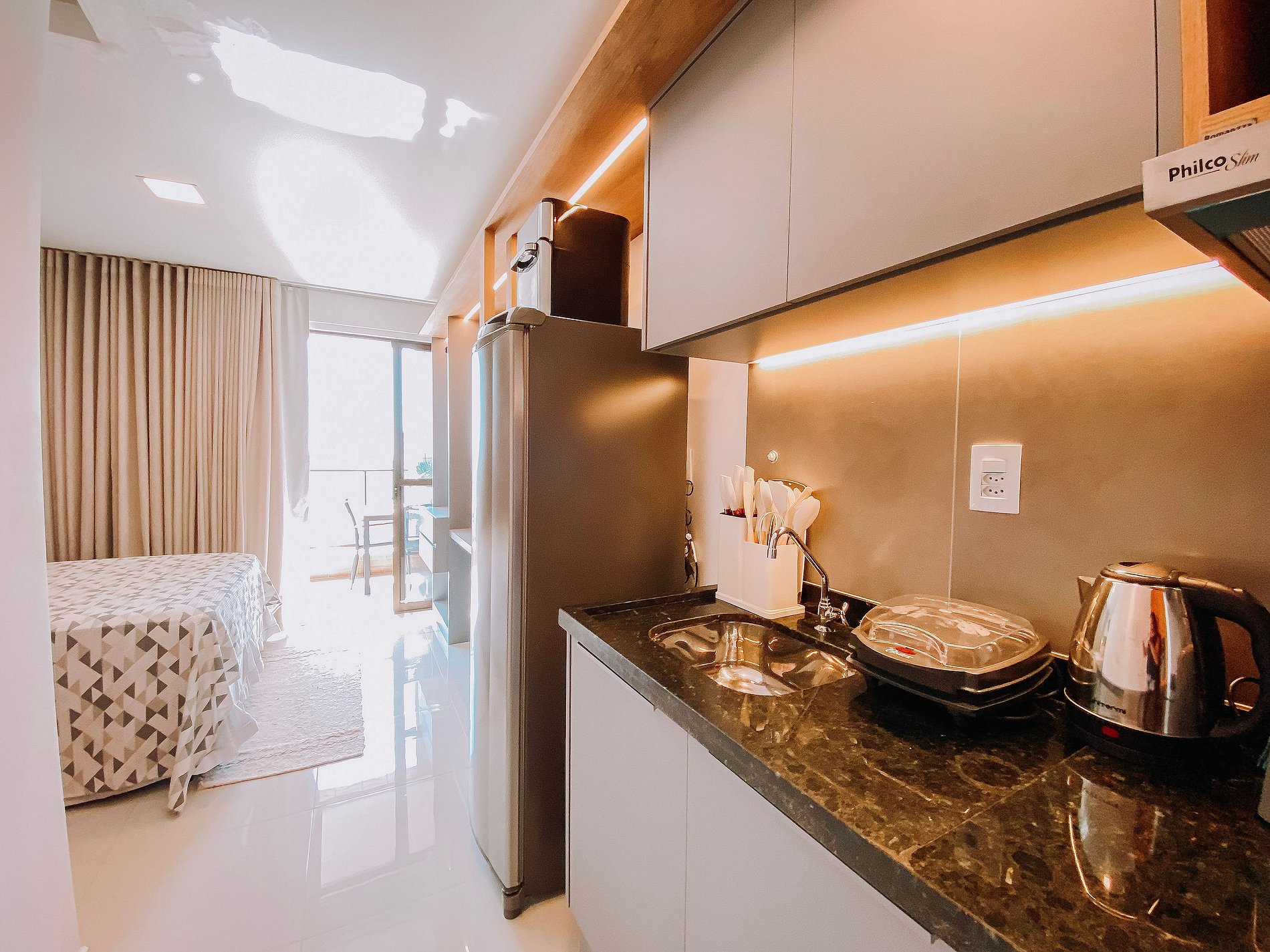 - Cozinha completa com geladeira, fogão de 2 bocas cooktop por indução, air fryer, jarra elétrica, sanduicheira, liquidificador, microondas, panelas, louças e utensílios;