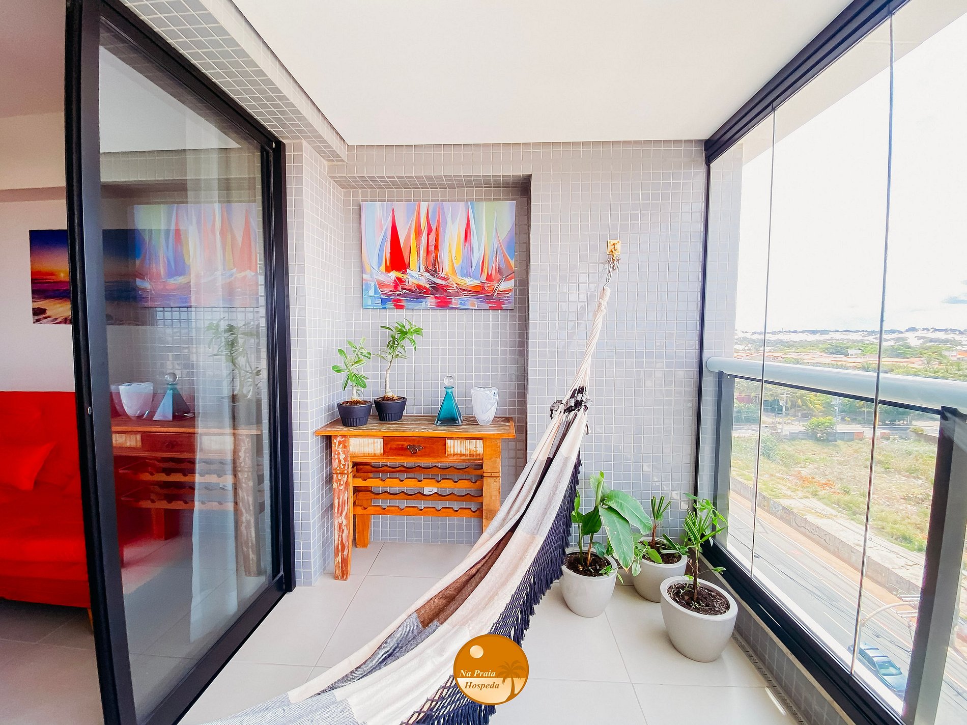 Entrada com fechadura eletrônica, bancada com 2 lugares + 2 cadeiras, Smart TV, Rack, Ventilador de Torre, Sofá cama, Cortina blackout e acesso à varanda com vista para as dunas.