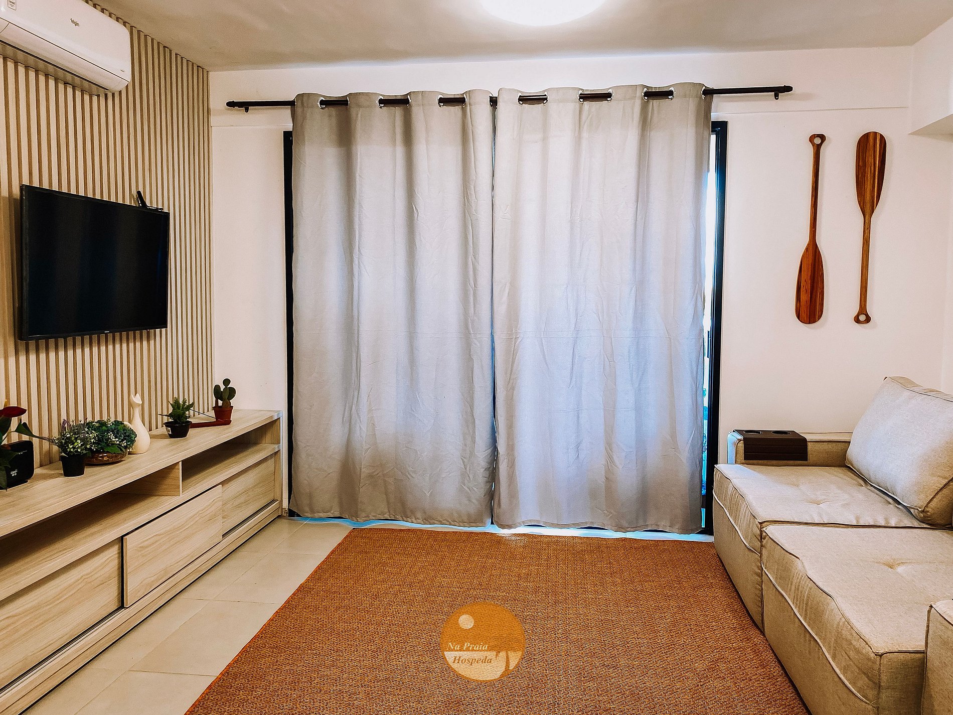 Entrada com fechadura eletrônica, Ar condicionado, Mesa com 4 lugares, Smart TV, Sofá cama, Cortina Blackout e Acesso à varanda.