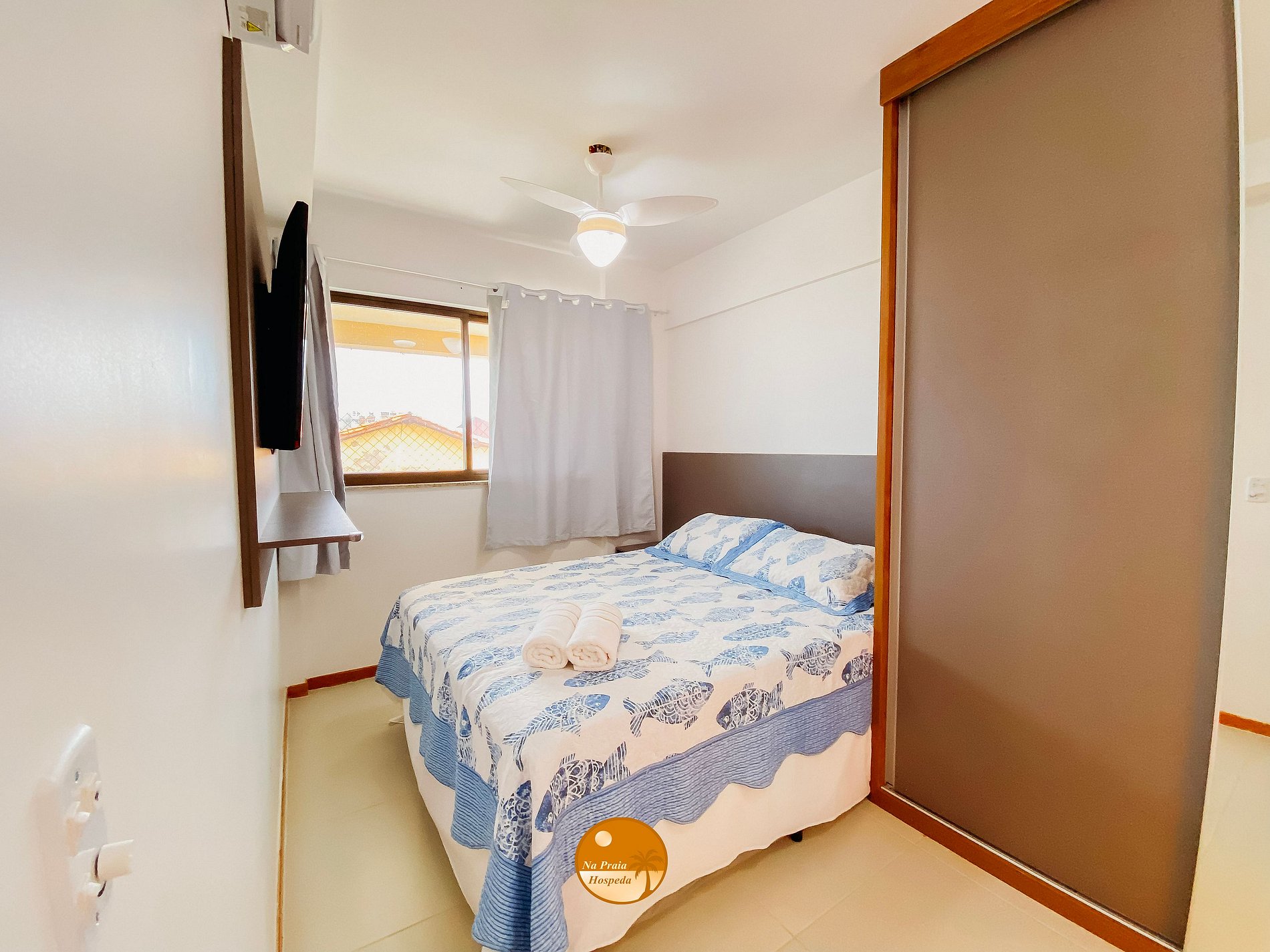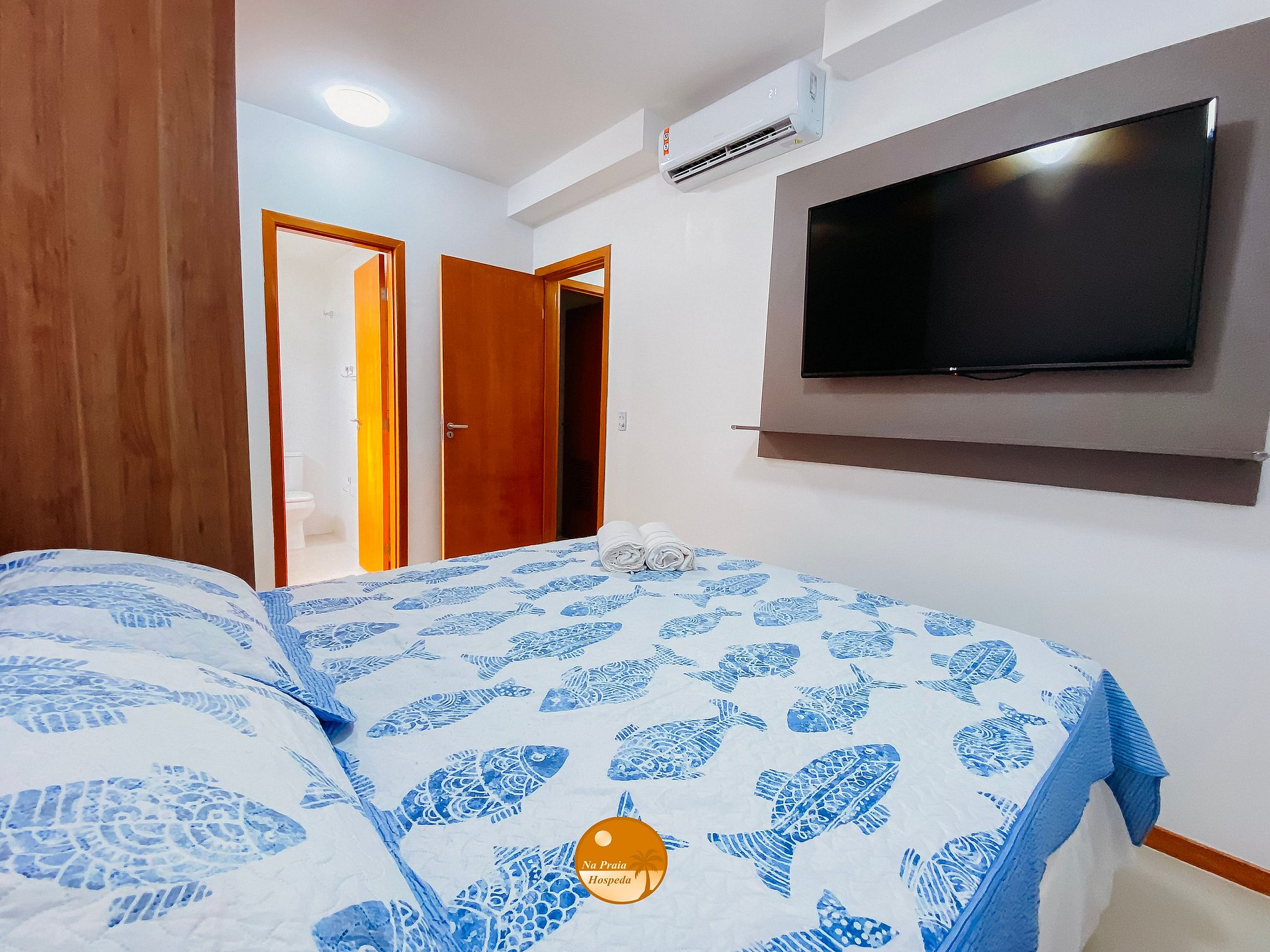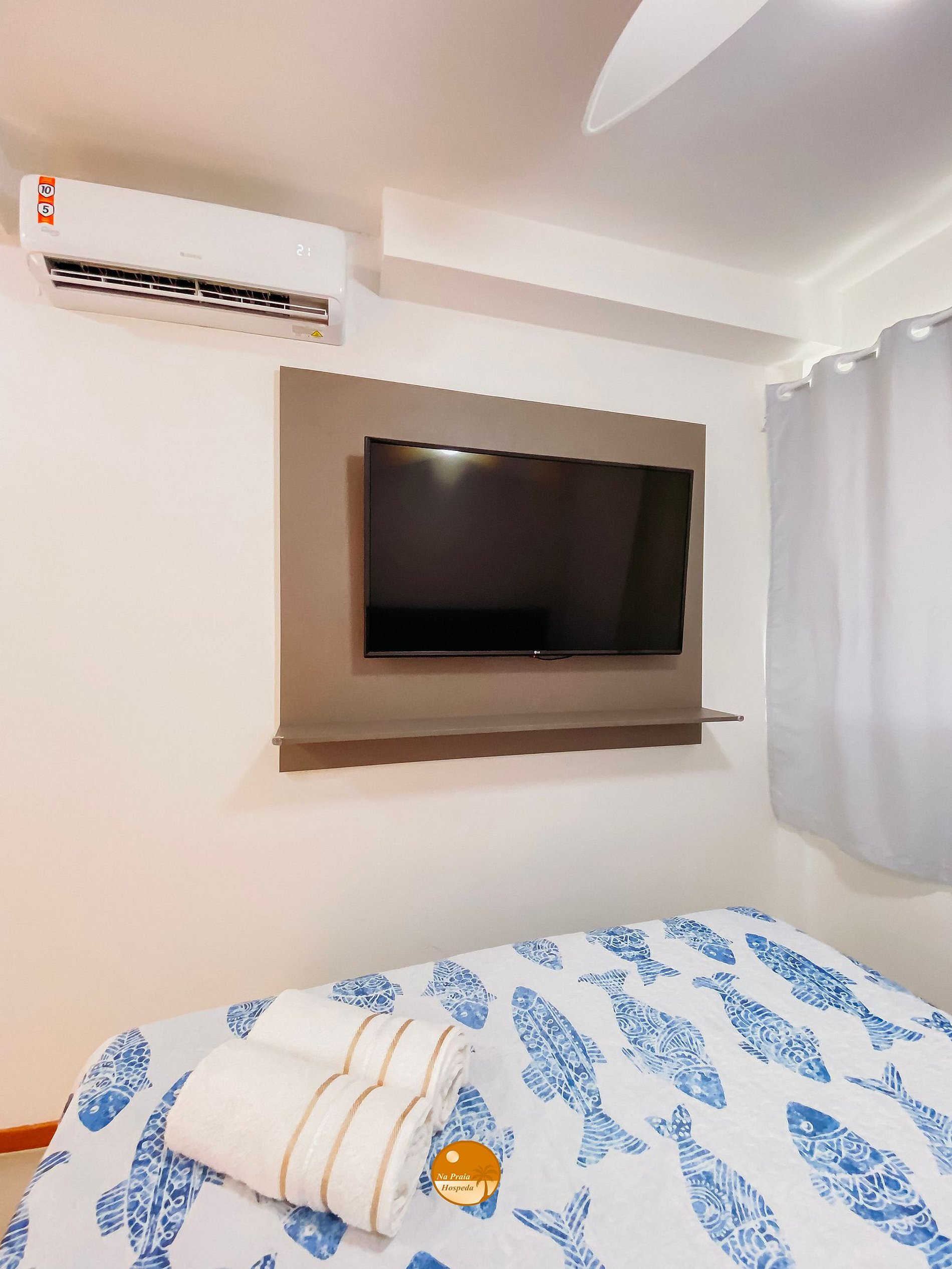 1 Cama de casal, Ar condicionado split, Ventilador de teto, Smart TV, Guarda roupas, 1 Mesa de cabeceira, secador de cabelos, Cortinas blackout, Banheiro completo com água quente e Vista lateral para o mar.