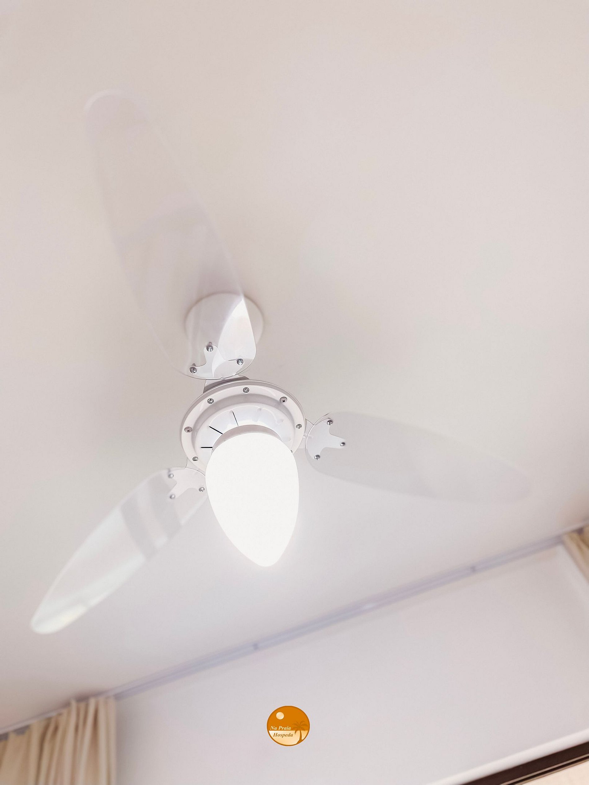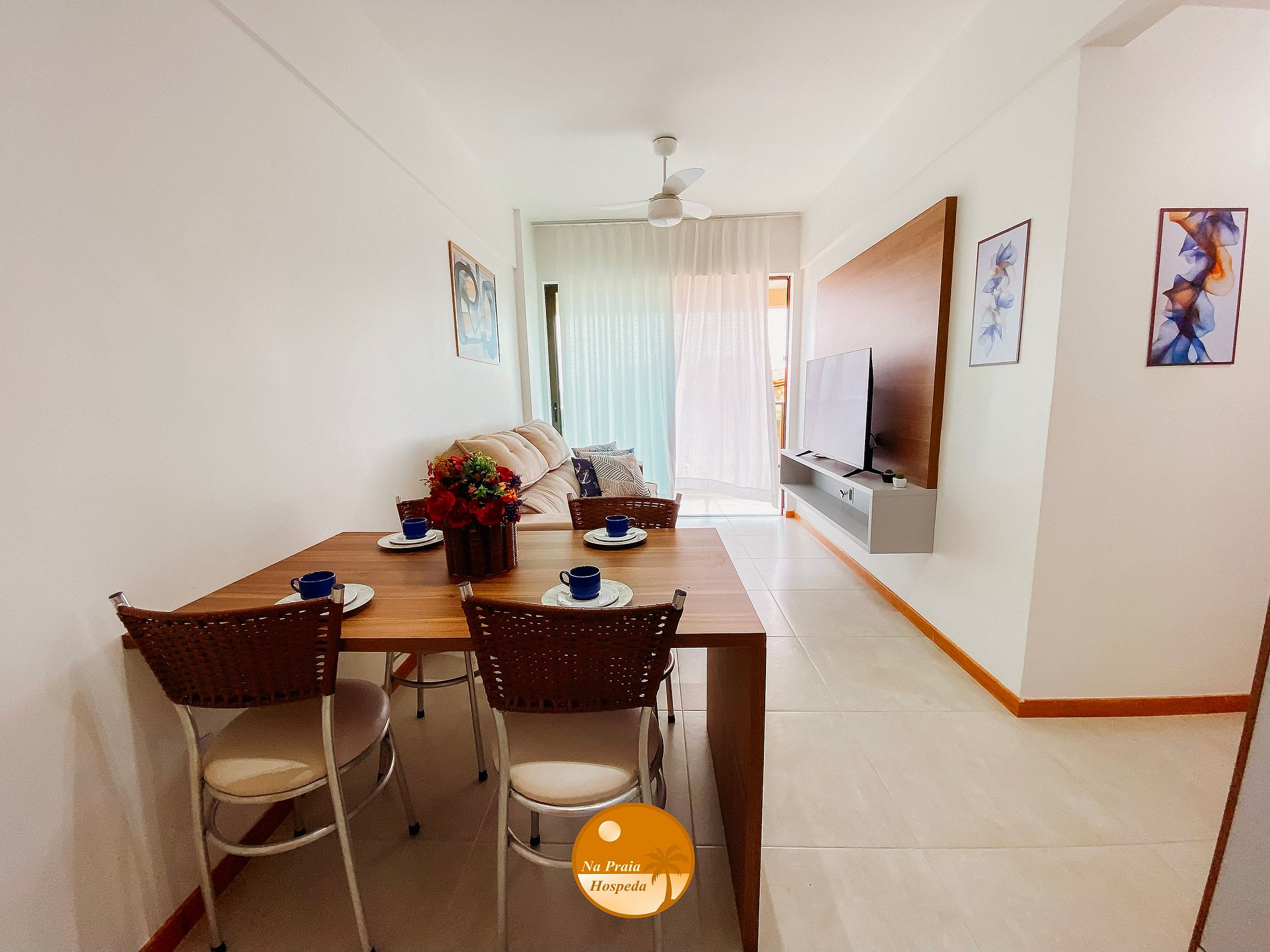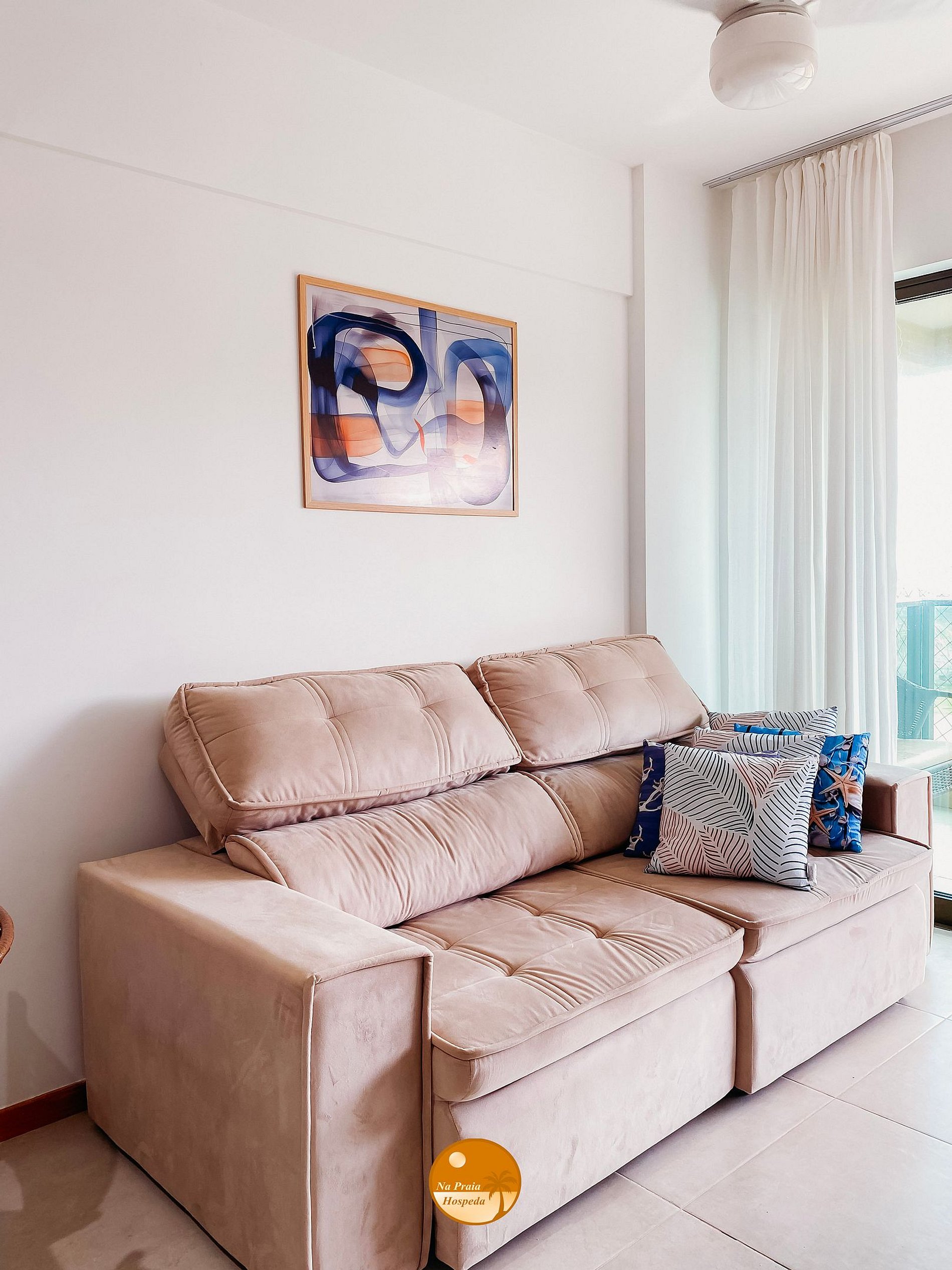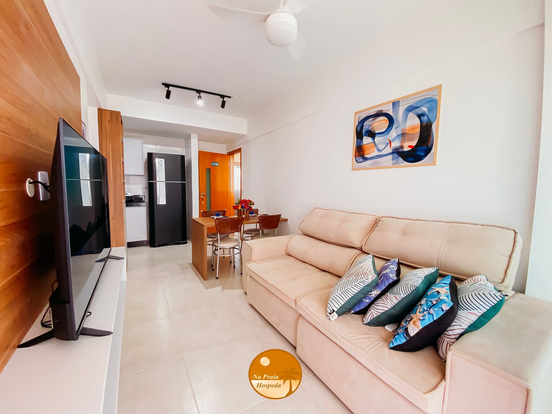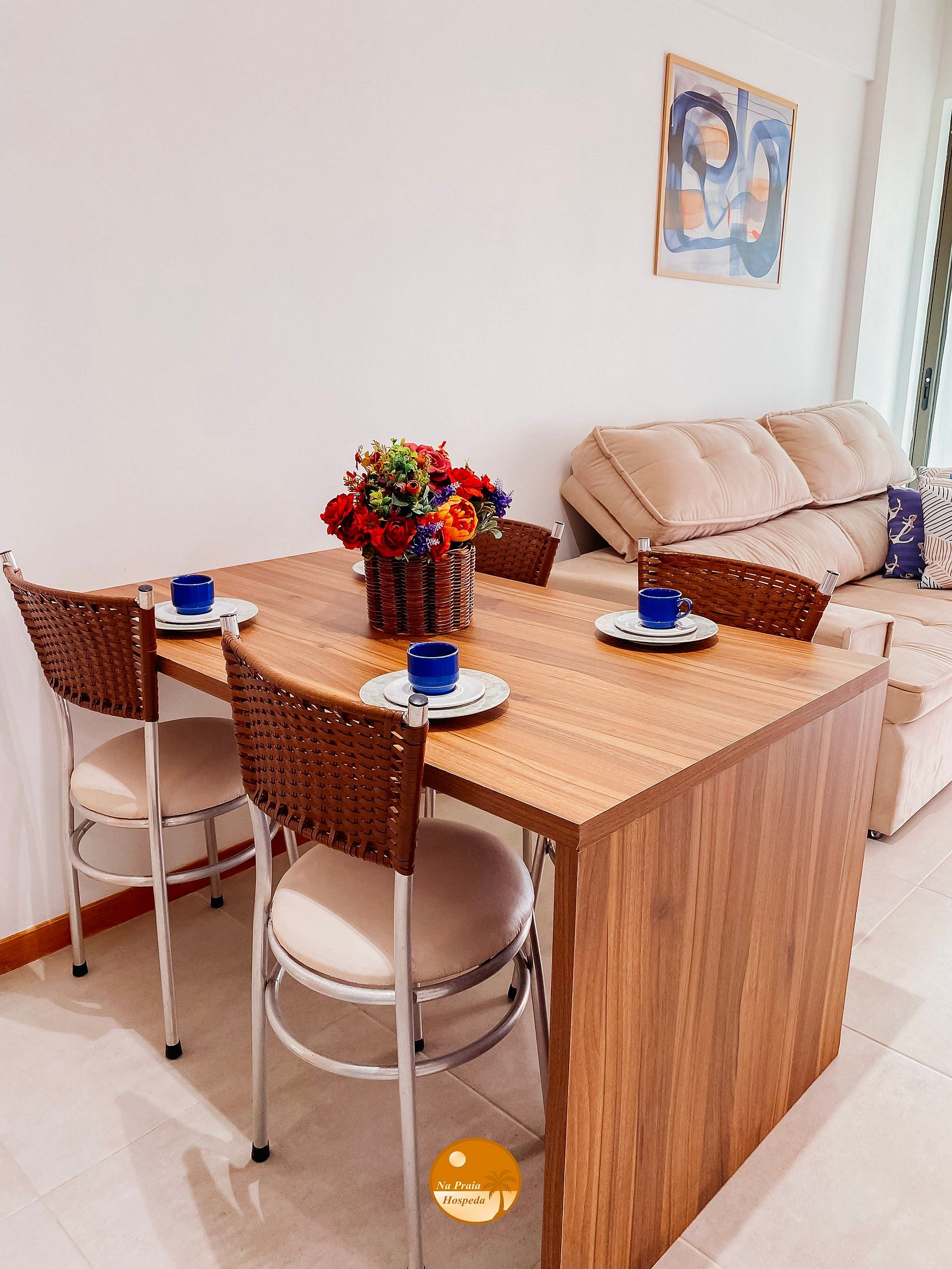 1 sofá-cama, 1 Smart TV, Rack, 1 Ventilador de coluna, 1 mesa com 4 cadeiras, ventilador de teto e acesso à varanda.