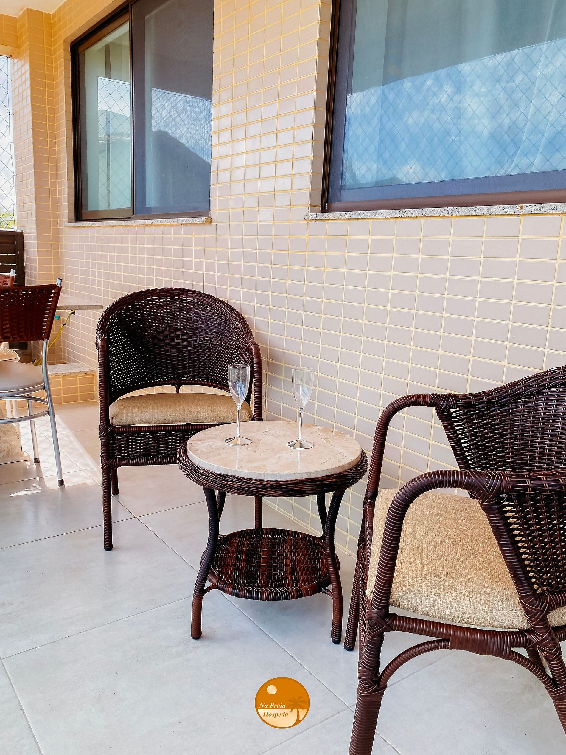 1 sofá 2 lugares, 2 poltronas, 1 mesa de centro, 1 mesa com 4 cadeiras, tela de proteção para crianças e animais.