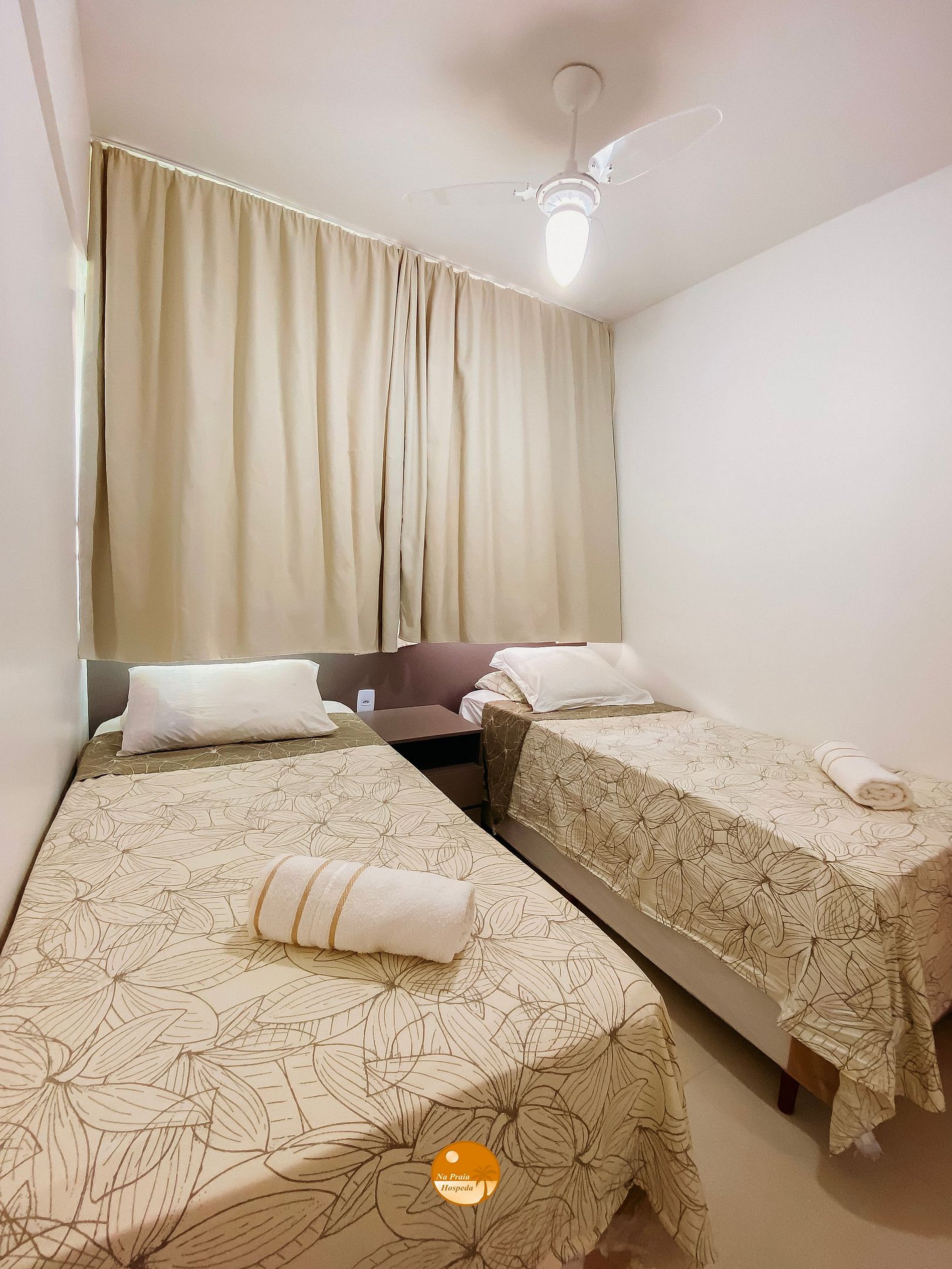 2 camas de solteiro, Ar condicionado split, Ventilador de teto, 1 cômoda, Continas blackout e Vista lateral para o mar.