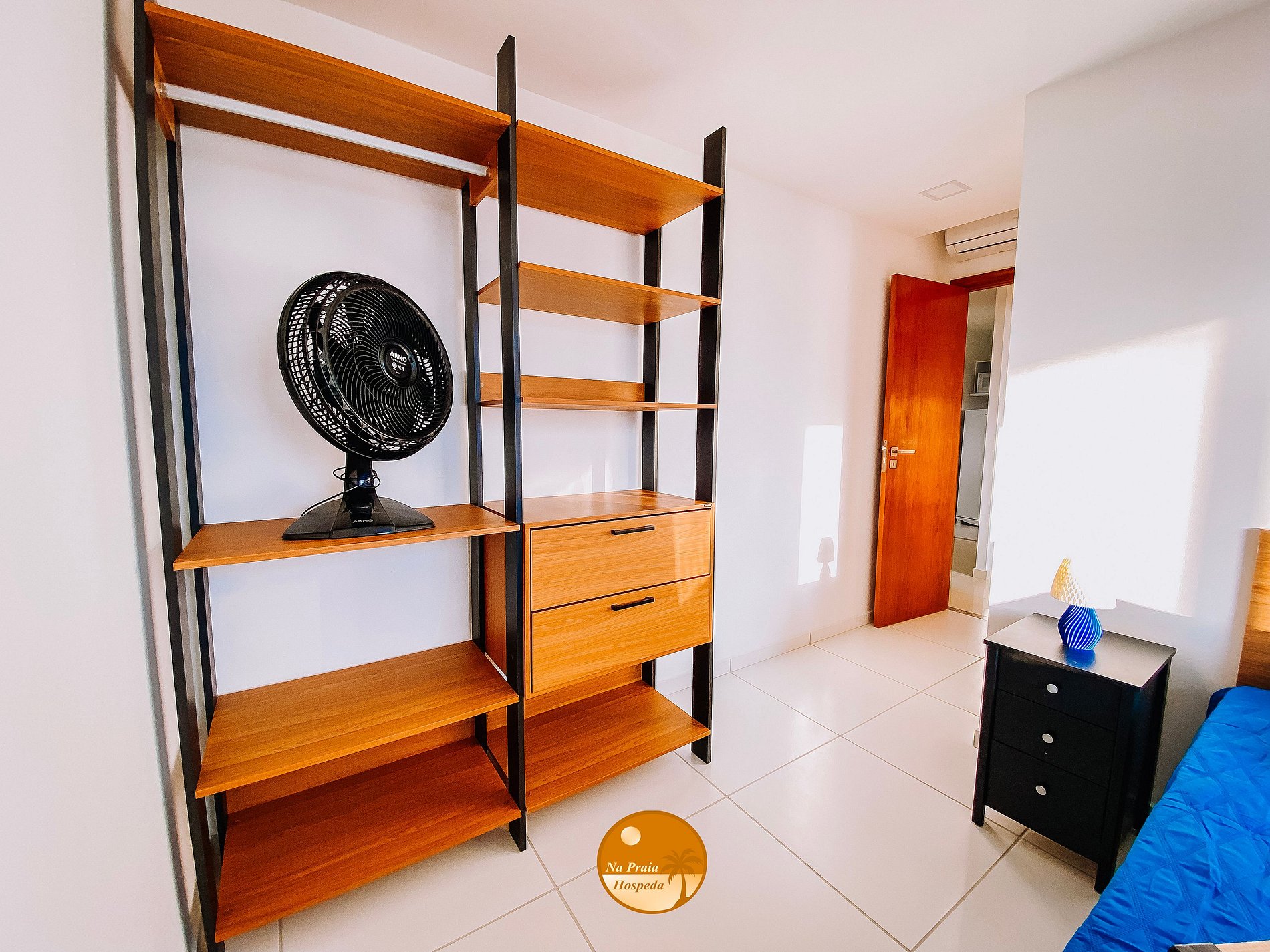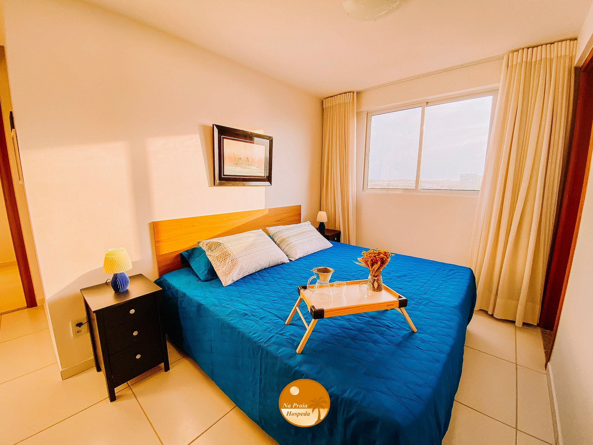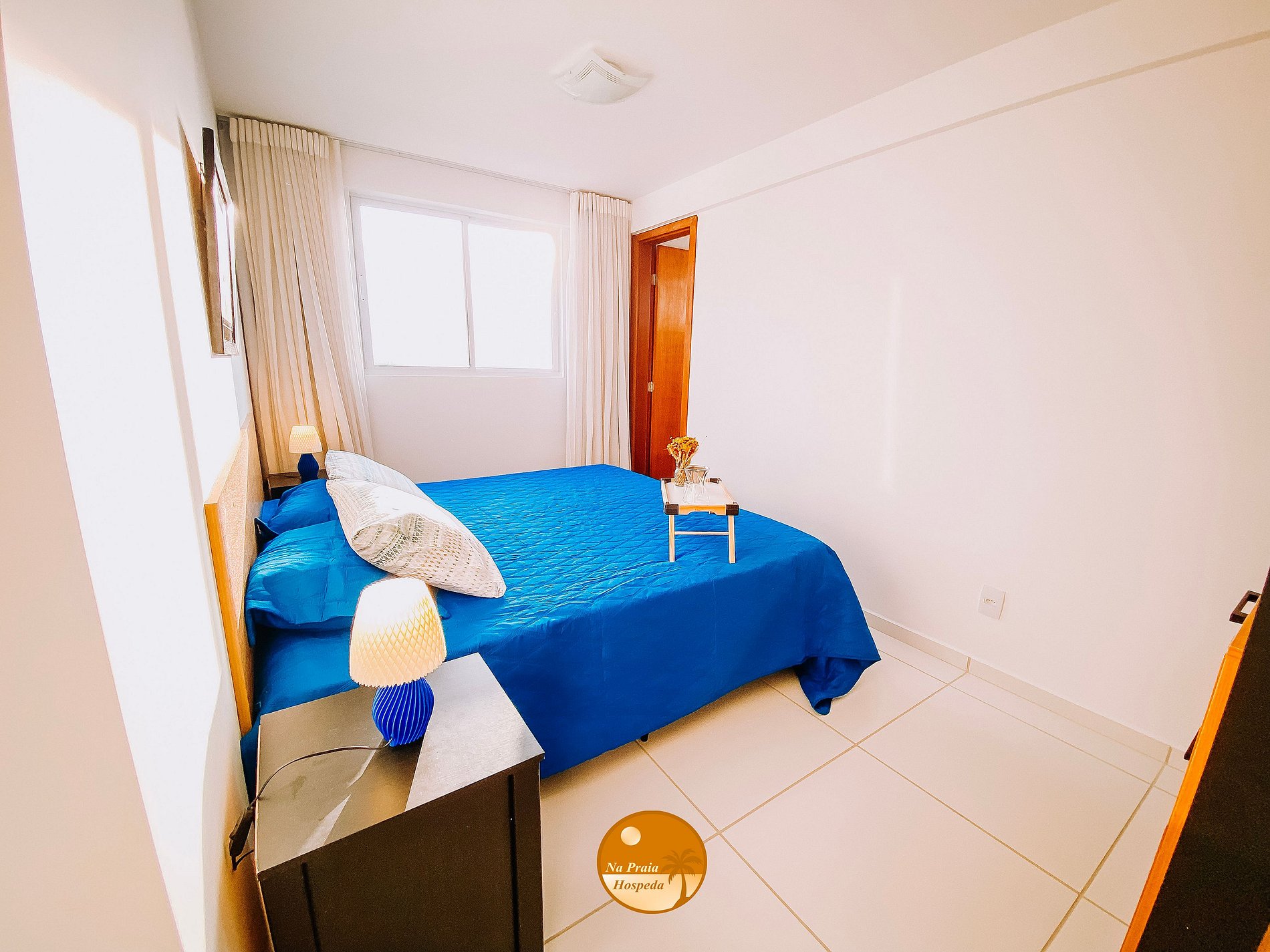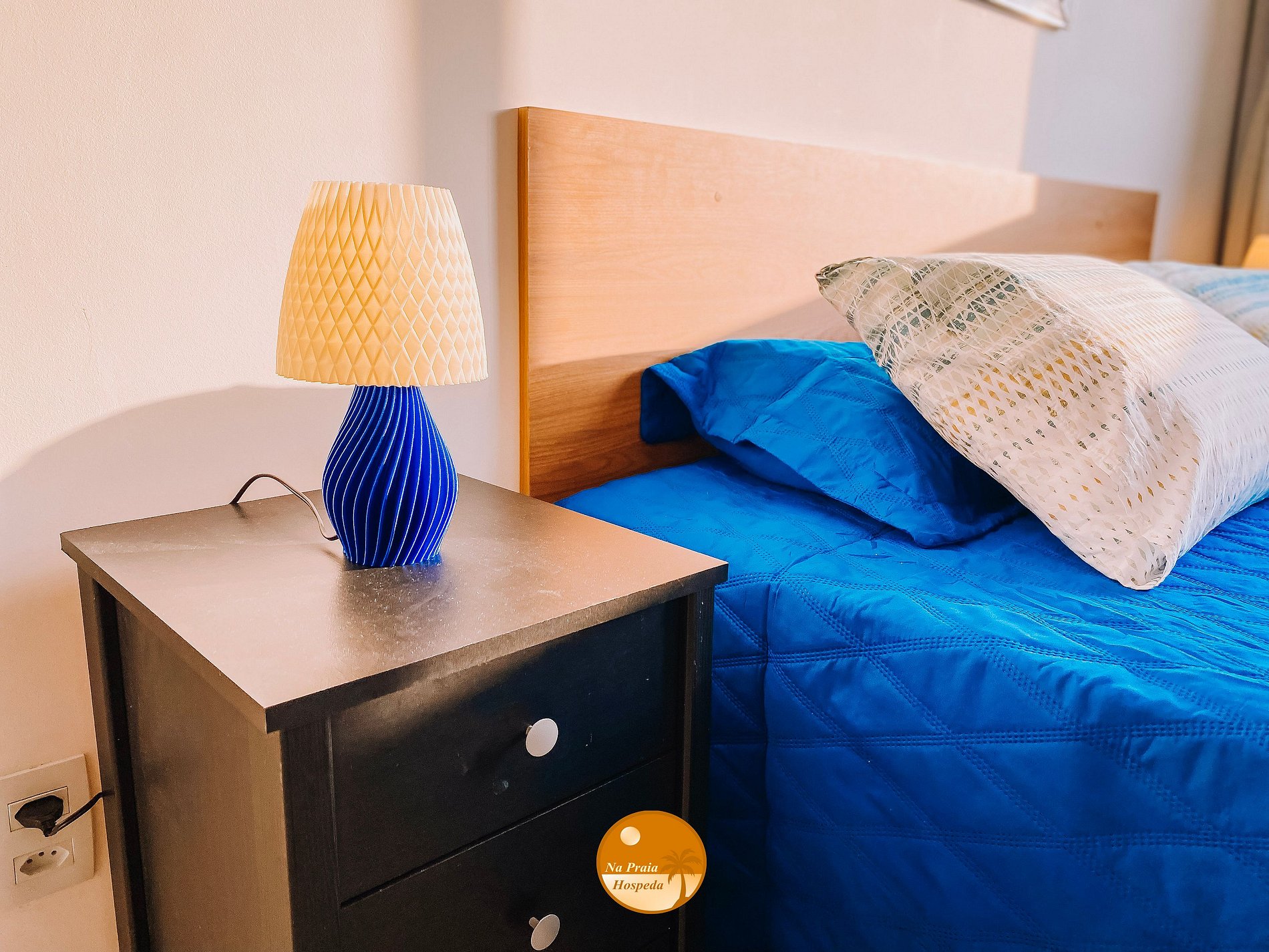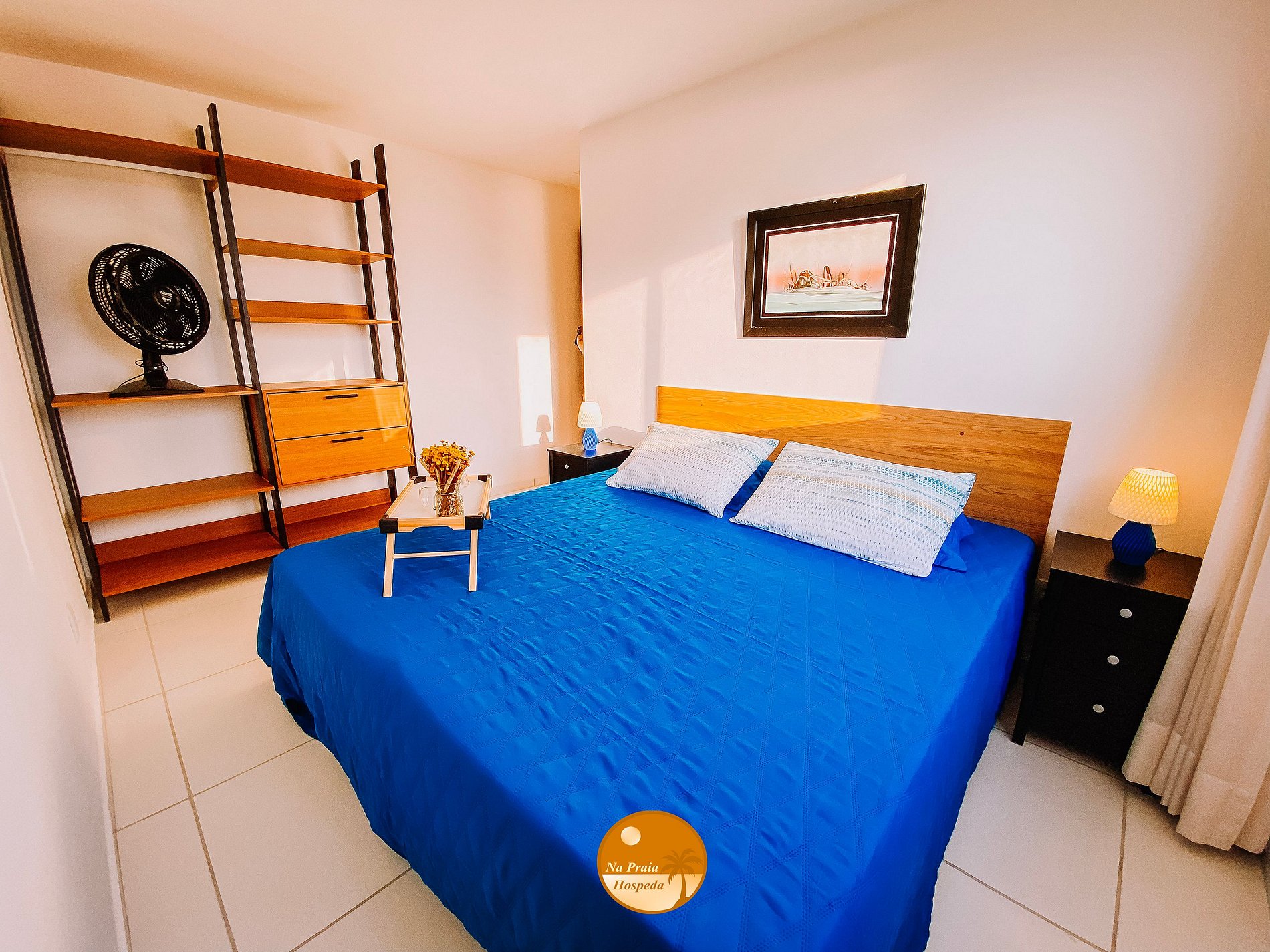 1 Cama de casal, Ar condicionado Split, 1 guarda roupas aberto com cabides, 2 Mesas de cabeceira, 2 Luminárias, Ventilador portátil, Cortina Blackout, Vista Mar, Banheiro completo com água quente e Secador de Cabelos.