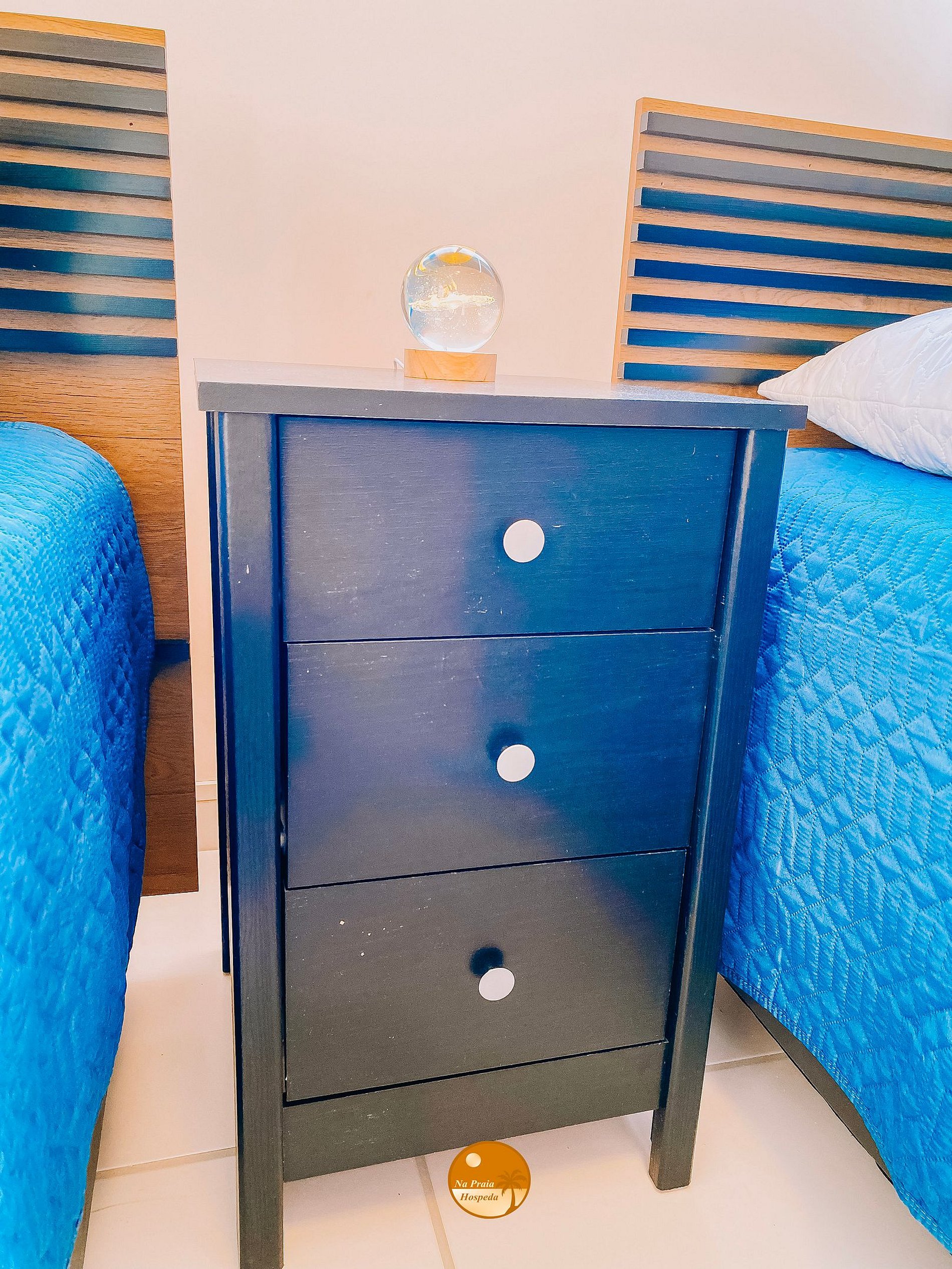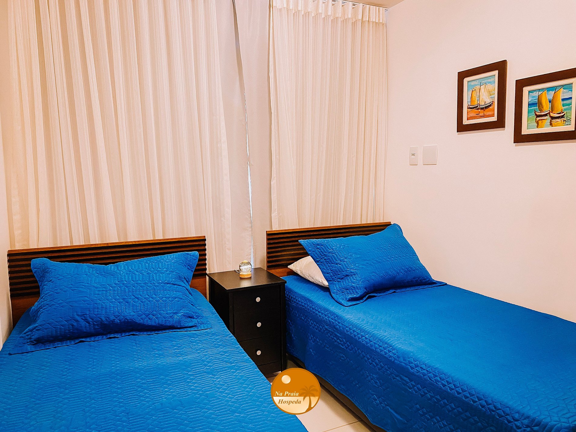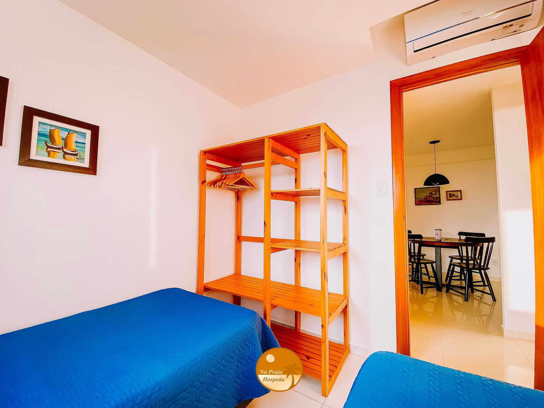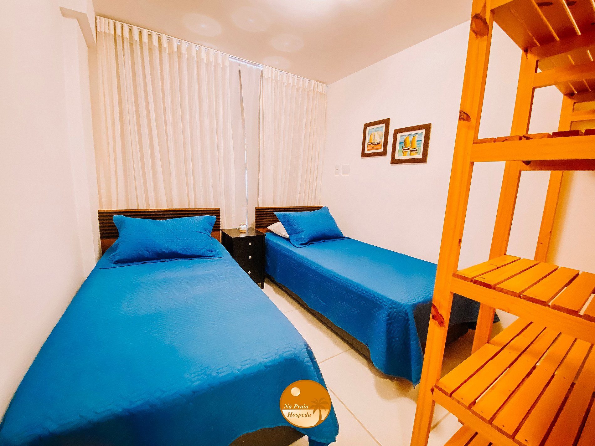 2 camas de solteiro, Ar condicionado Split, 1 Guarda Roupas aberto com cabides, 1 mesa de cabeceira, 1 luminária, Cortina Blackout e Vista Mar.