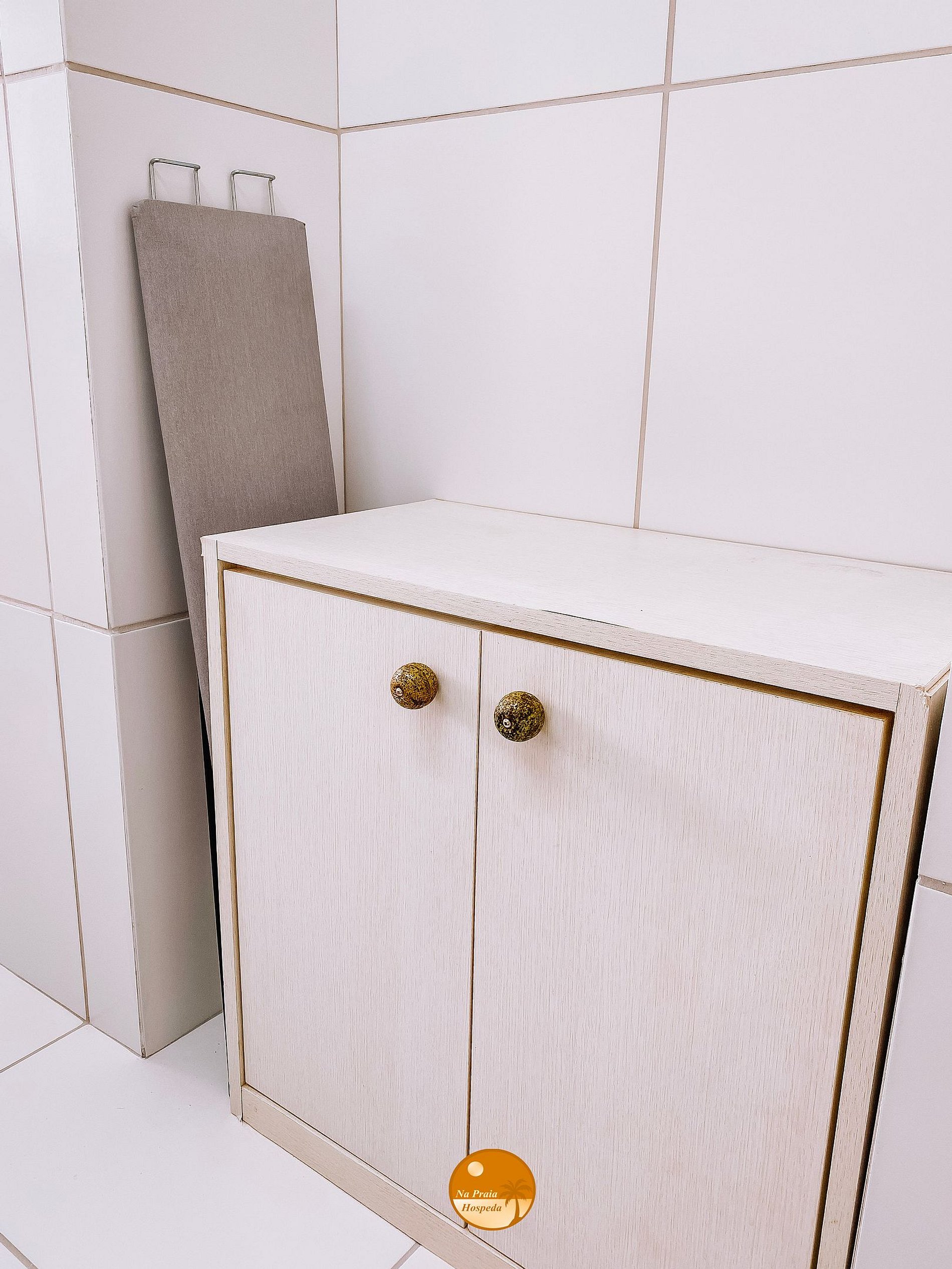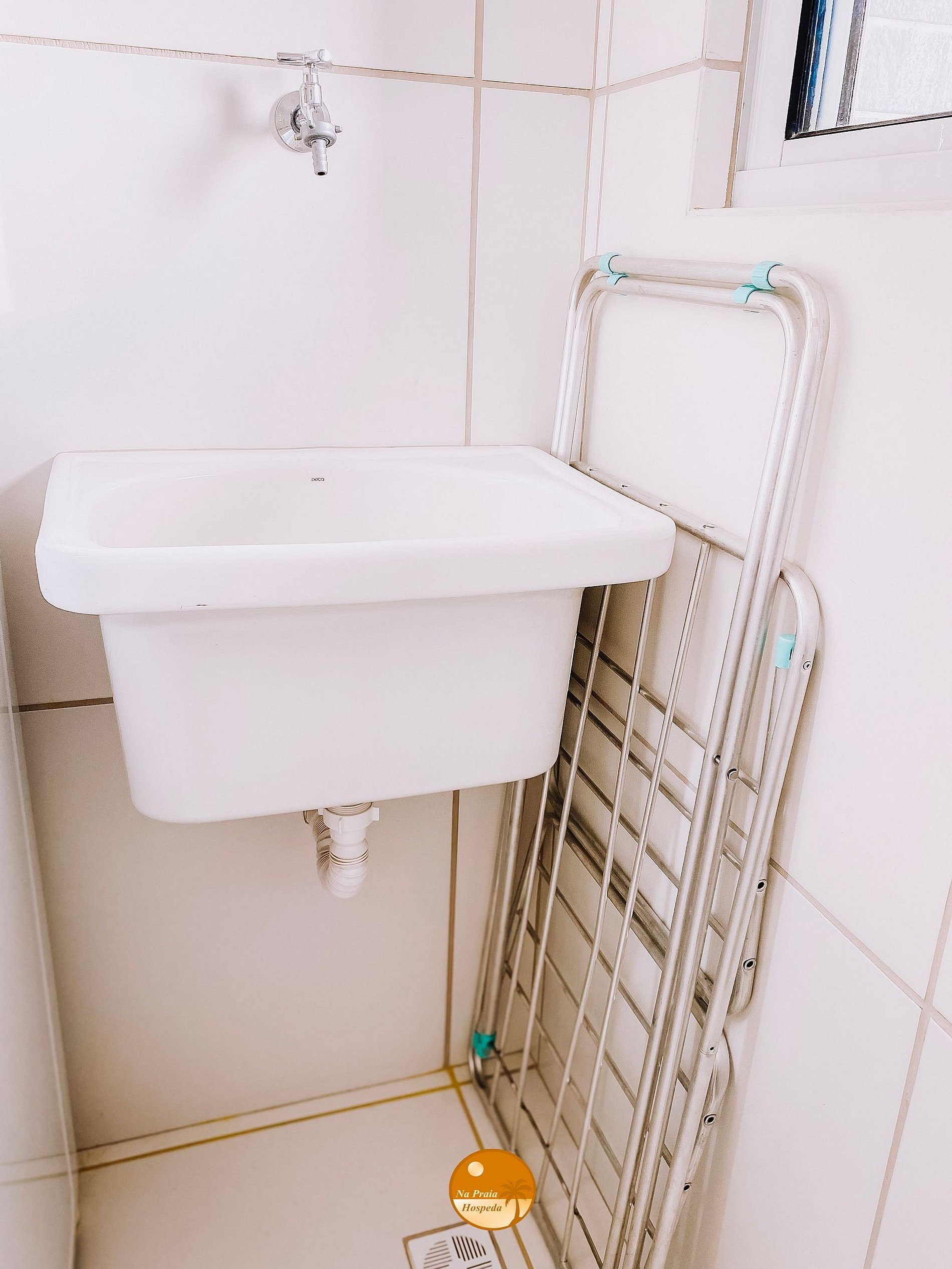 Máquina de lavar roupas, Varal de chão, Armário, Ferro e Tábua de passar.