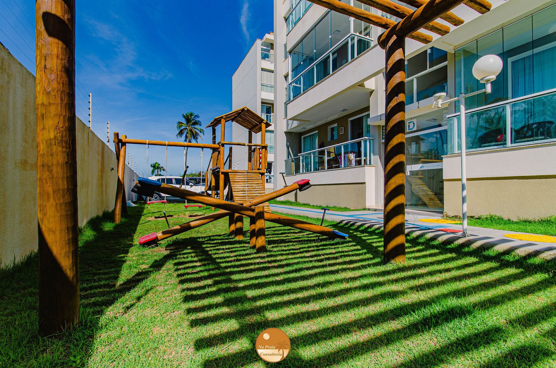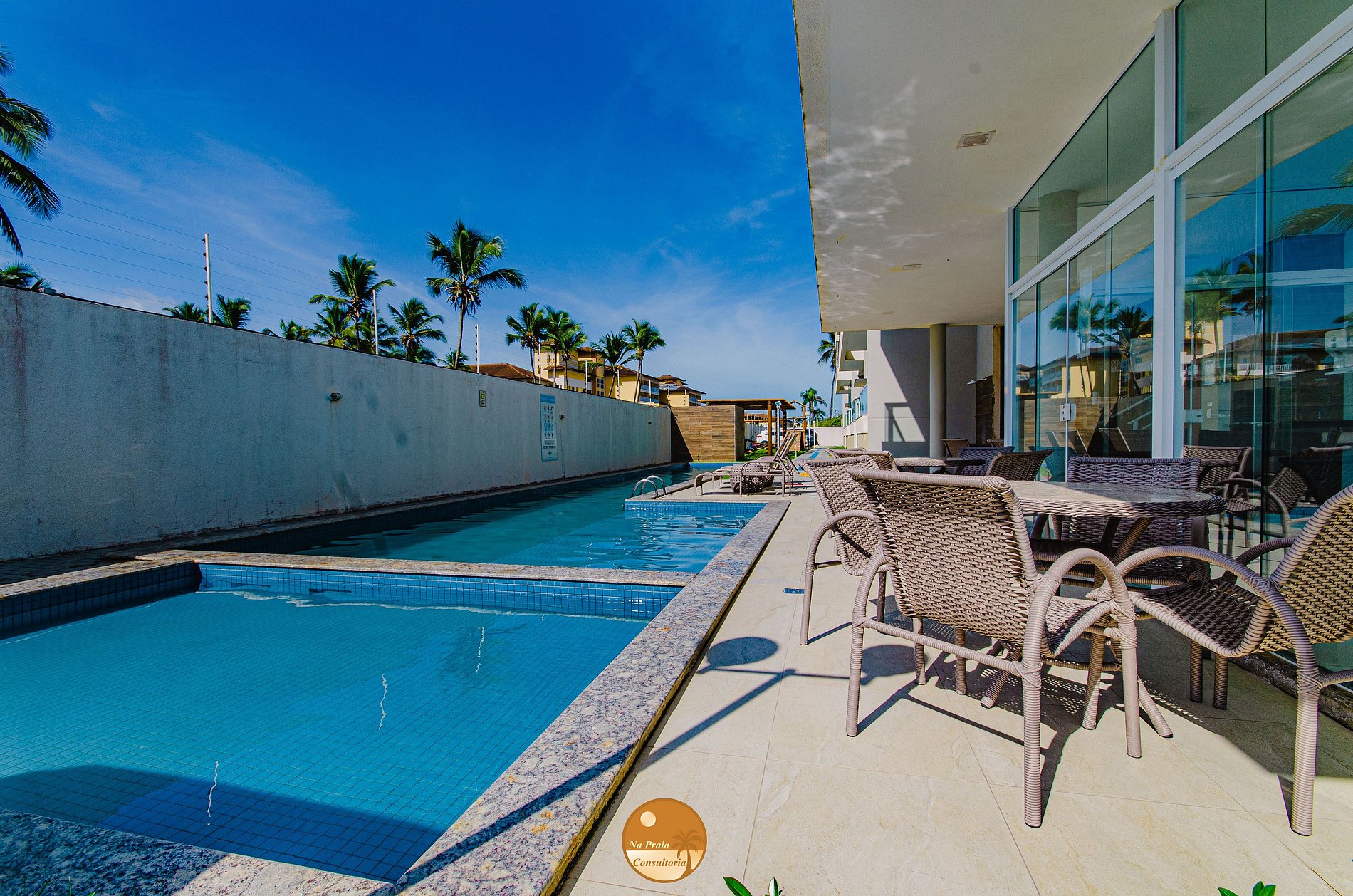 No condomínio, você poderá utilizar as piscinas e o parque infantil, assim como mesas, cadeiras e espreguiçadeiras.