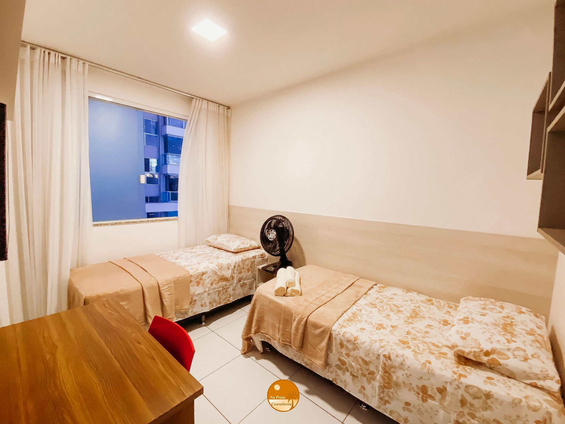 * Quarto 2: 2 Camas de solteiro com cama auxiliar, Split, mesa de trabalho, livros, Smart TV e continas blackout.