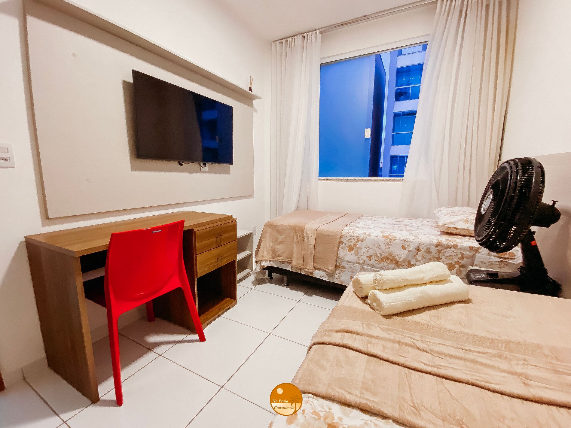 * Quarto 2: 2 Camas de solteiro com cama auxiliar, Split, mesa de trabalho, livros, Smart TV e continas blackout.