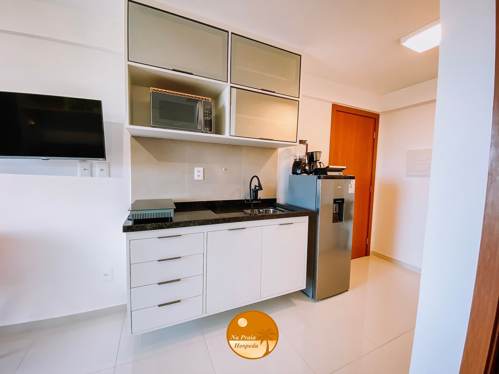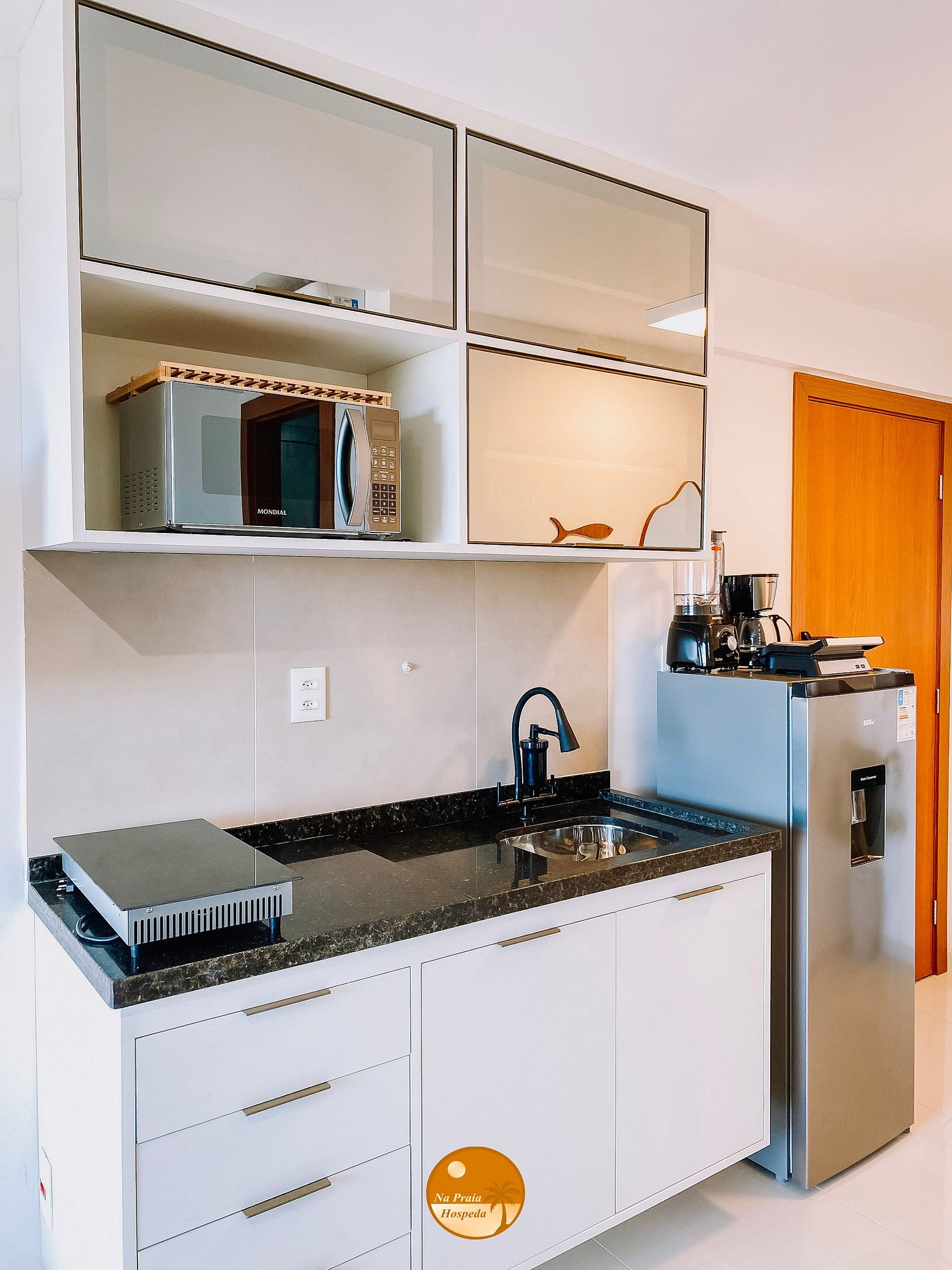- Cozinha completa com geladeira, fogão de 2 bocas cooktop por indução, filtro de água, microondas, sanduicheira, liquidificador, panelas, louças e utensílios;